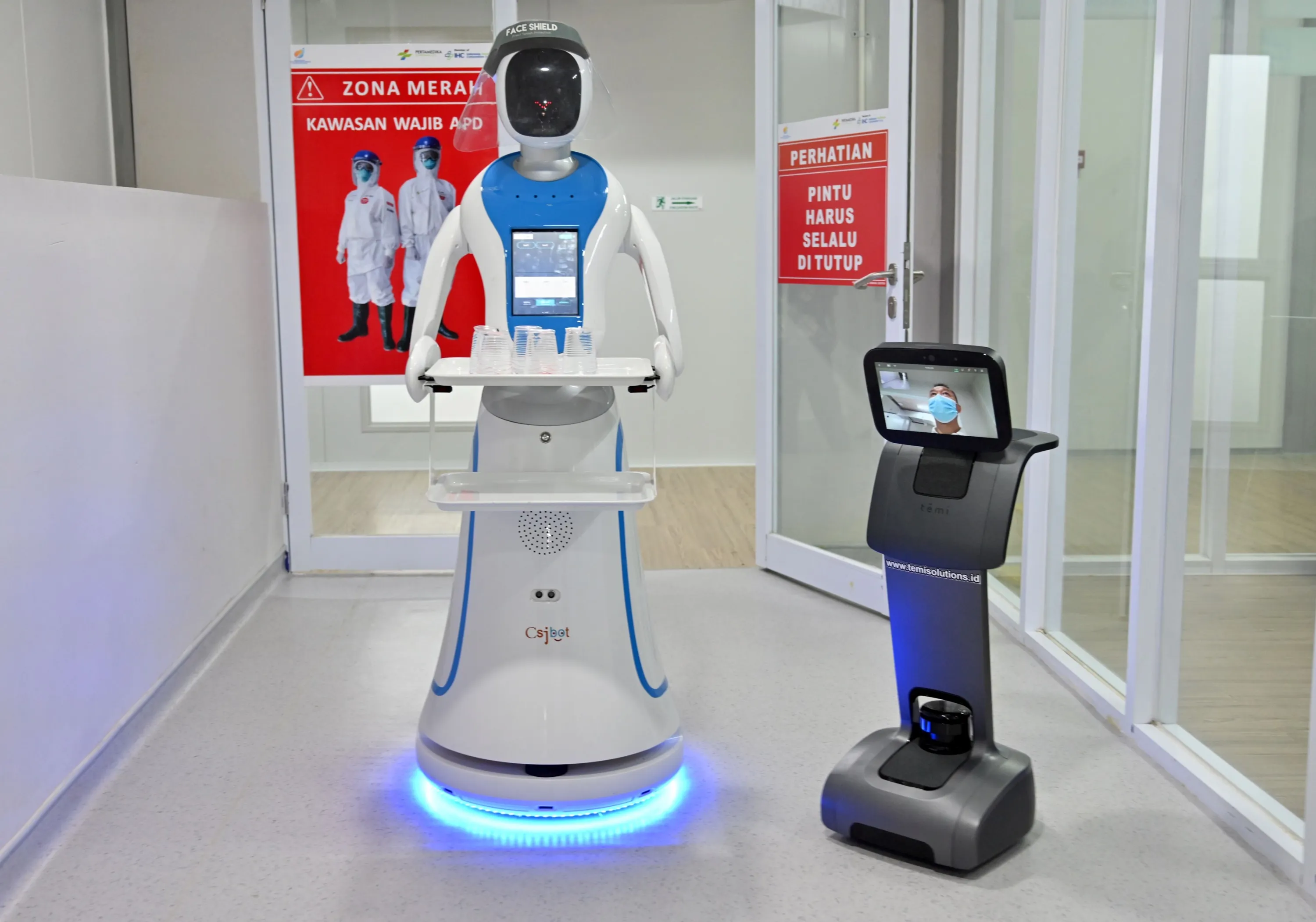 This China-made robot called Amy (L) and US-made called Temi (R) are seen during a simulation to assist medical team in handling patients with the COVID-19 coronavirus at the Pertamina Jaya hospital in Jakarta on April 16, 2020. (Photo by Adek Berry/AFP Photo)
