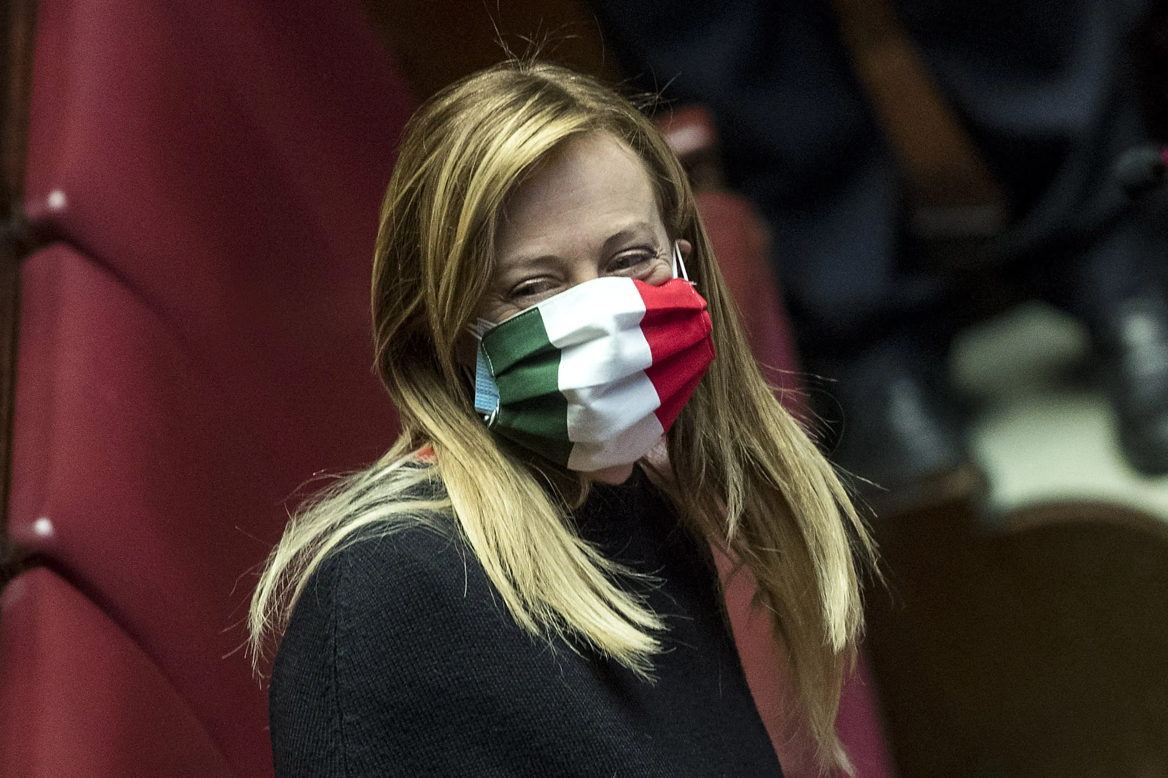 Leader of Fratelli d'Italia (Brothers of Italy) party, Giorgia Meloni, wears a mask in the colors of the Italian flag as she attends a session of the Italian Parliament in Rome, Thursday, April 16, 2020. Italy’s hardest-hit region of Lombardy is pushing to relaunch manufacturing on May 4, the day that the national lockdown is set to lift. Lombardy’s plan focuses on maintaining a one-meter distance between workers, mandating the use of masks, mobile working where possible and the use of anti-body blood testing, which is set to launch in the region on April 21, to get a better picture of where the virus is still active. (Photo by Roberto Monaldo/LaPresse via AP Photo)
