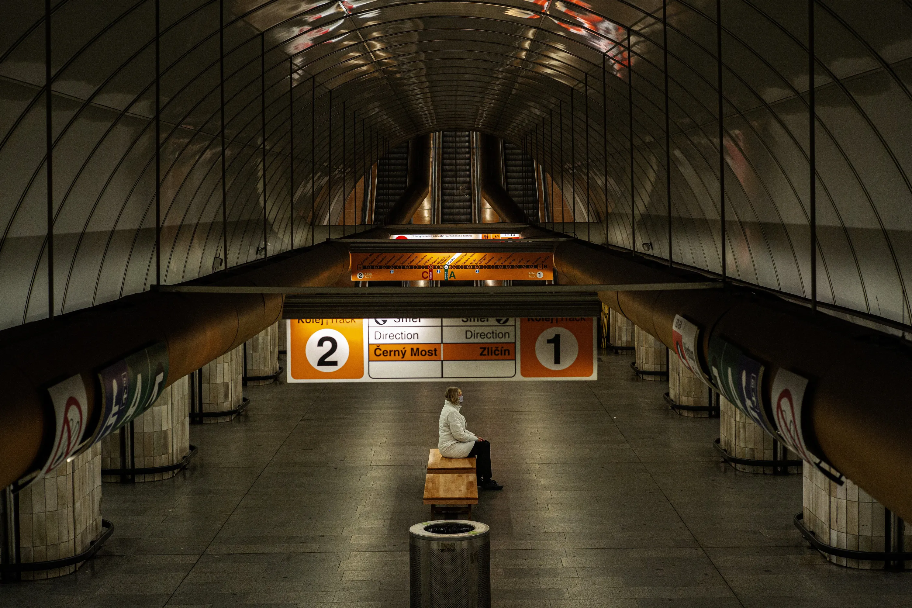 A woman wearing a face mask sits on a bench at an empty metro station on April 15, 2020 in Prague amid restrictions due to the new coronavirus pandemic. (Photo by Michal Cizek/AFP Photo)