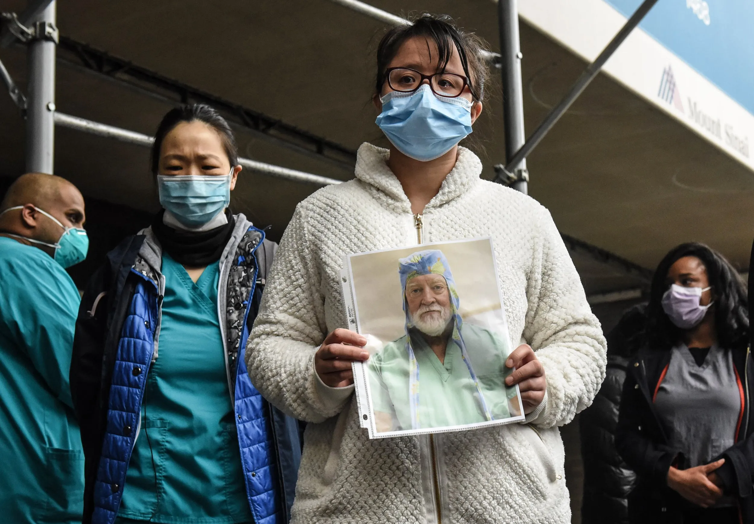Mt. Sinai medical workers hold up photos of medical workers who have died from the coronavirus during a protest on April 3, 2020 in New York City. Medical workers are protesting the lack of personal protective equipment during a surge in coronavirus cases. (Photo by Stephanie Keith/Getty Images)