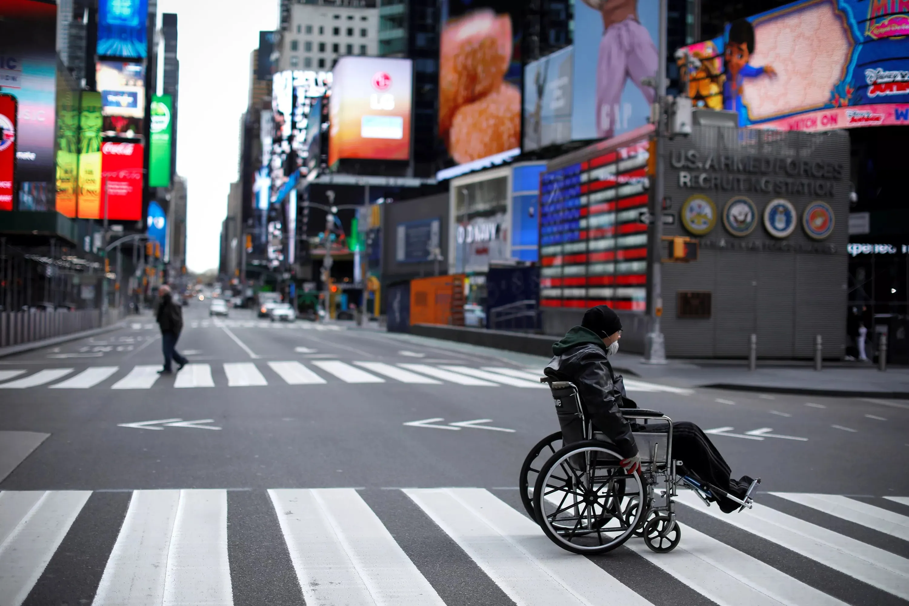 A man in a wheelchair crosses a nearly empty 7th Avenue in Times Square in Manhattan during the outbreak of the coronavirus disease (COVID-19) in New York City, New York, U.S., April 7, 2020. (Photo by Mike Segar/Reuters)
