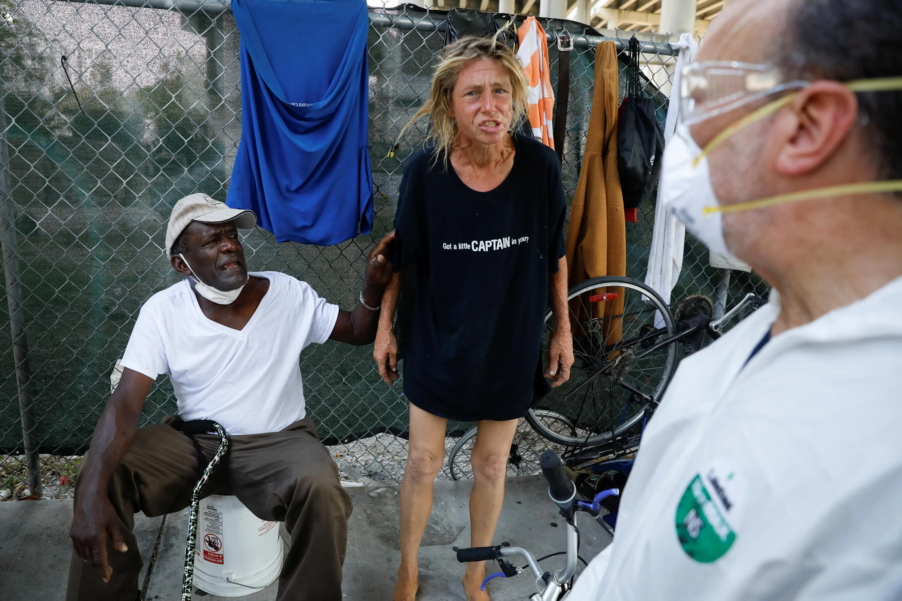 A homeless woman reacts next to a worker collecting samples during a Miami-Dade County testing operation for the coronavirus disease (COVID-19), in downtown Miami, Florida, U.S., April 16, 2020. (Photo by Marco Bello/Reuters)