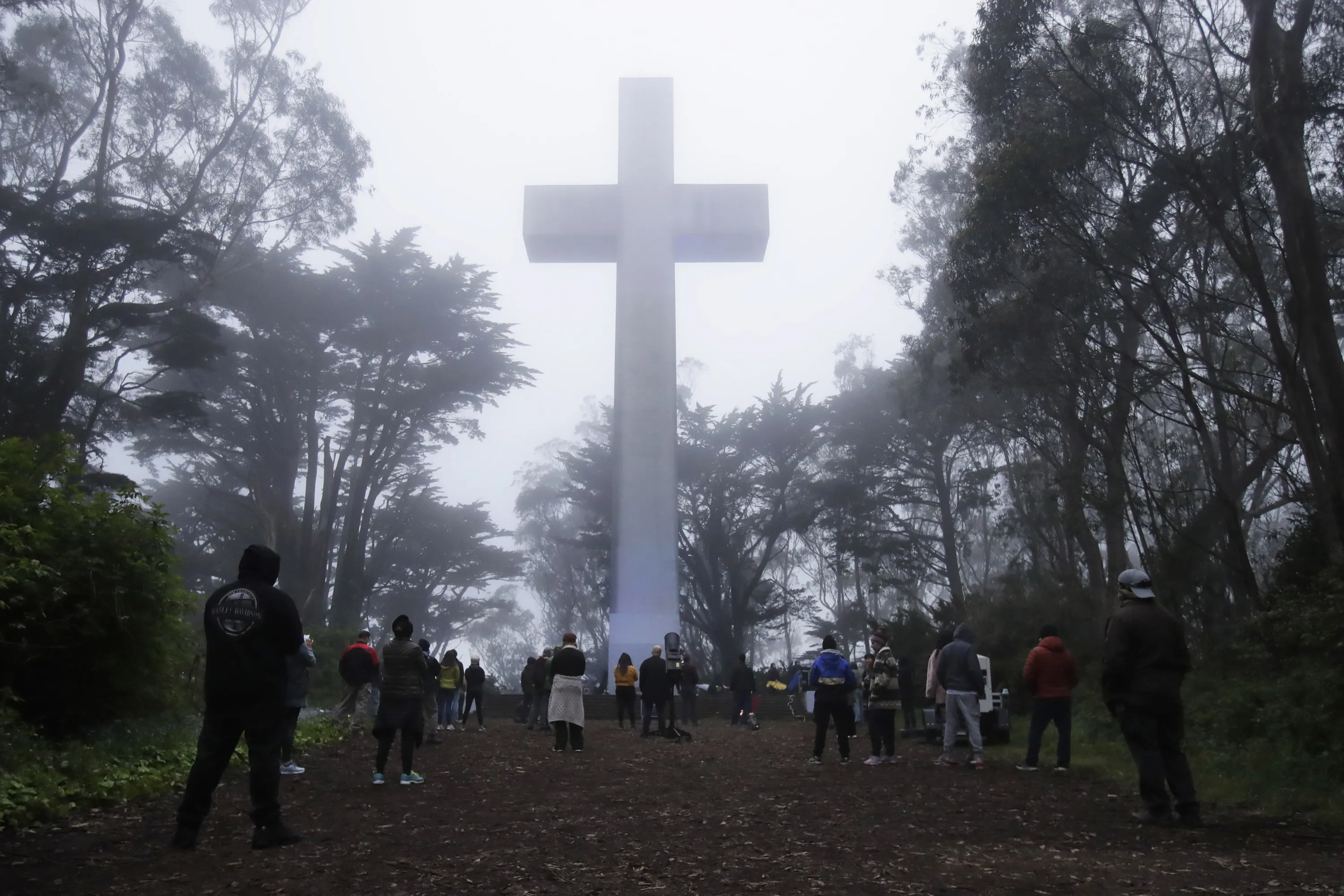People gather at the Mount Davidson cross in San Francisco, Sunday, April 12, 2020. Mount Davidson's annual Easter Sunrise Service was canceled for San Francisco's shelter in place orders over coronavirus concers. (Photo by Jeff Chiu/AP Photo)