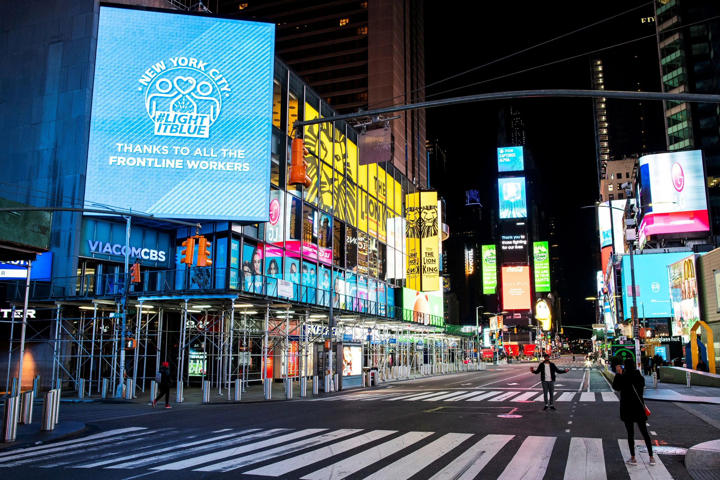 People walk in Times Square, Manhattan while some screens are seen illuminated in blue as part of the “Light It Blue” initiative to honor healthcare workers during the outbreak of the coronavirus disease (COVID-19) in New York City, New York, U.S., April 9, 2020. (Photo by Eduardo Munoz/Reuters)