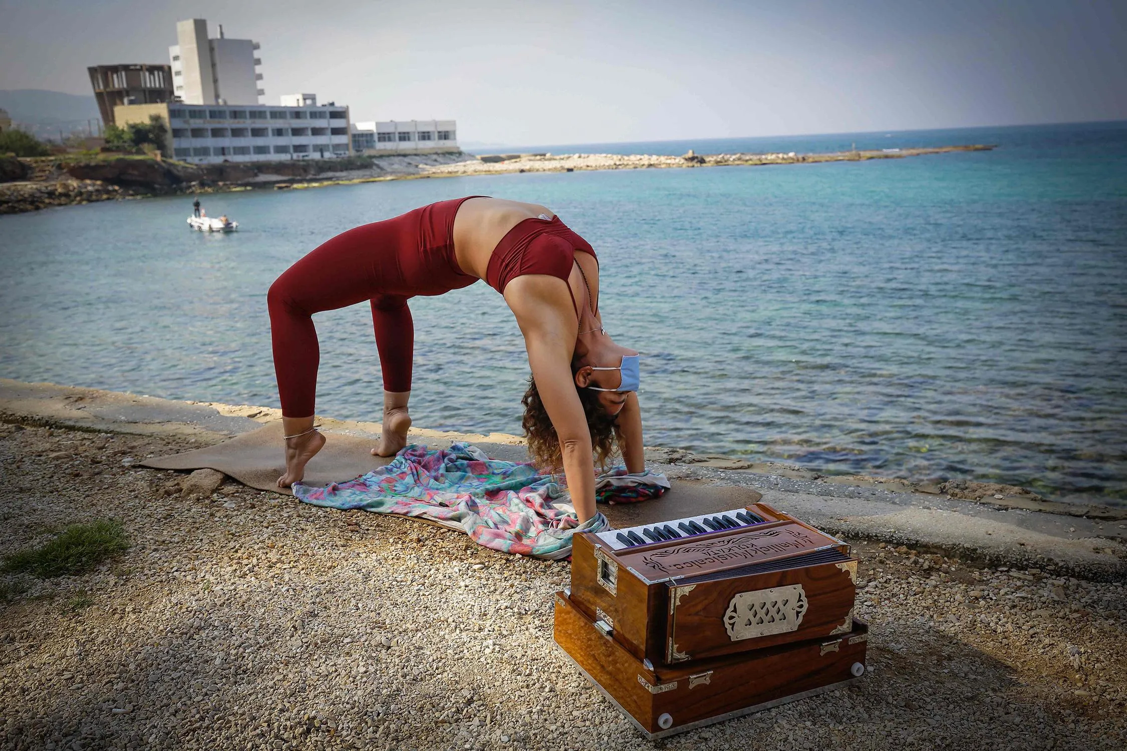 Lebanese yoga instructor Jihane Nasrallah practises morning yoga at the seafront while wearing a mask during COVID-19 coronavirus pandemic in the northern coastal city of Batroun, Lebanon on April 15, 2020. (Photo by Ibrahim Chalhoub/AFP Photo)