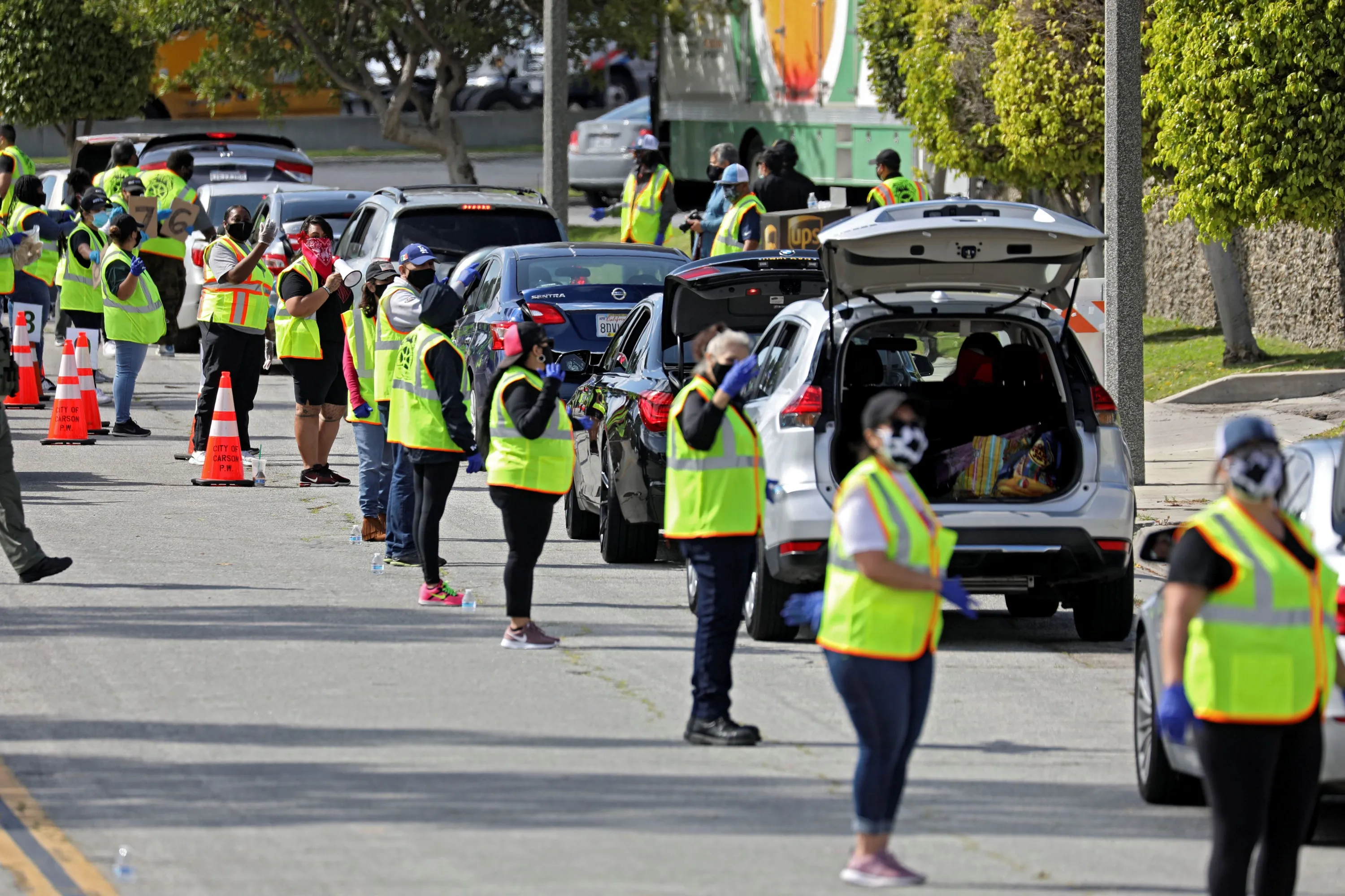 Volunteers control traffic flow as households receive boxes of food at a drive-thru food distribution site from the Los Angeles Regional Food Bank and Los Angeles County Federation of Labor as authorities encourage social distancing to prevent the spread of coronavirus disease (COVID-19) outside the Teamsters Local 572 office in Carson, California, U.S., April 18, 2020. (Photo by Patrick T. Fallon/Reuters)