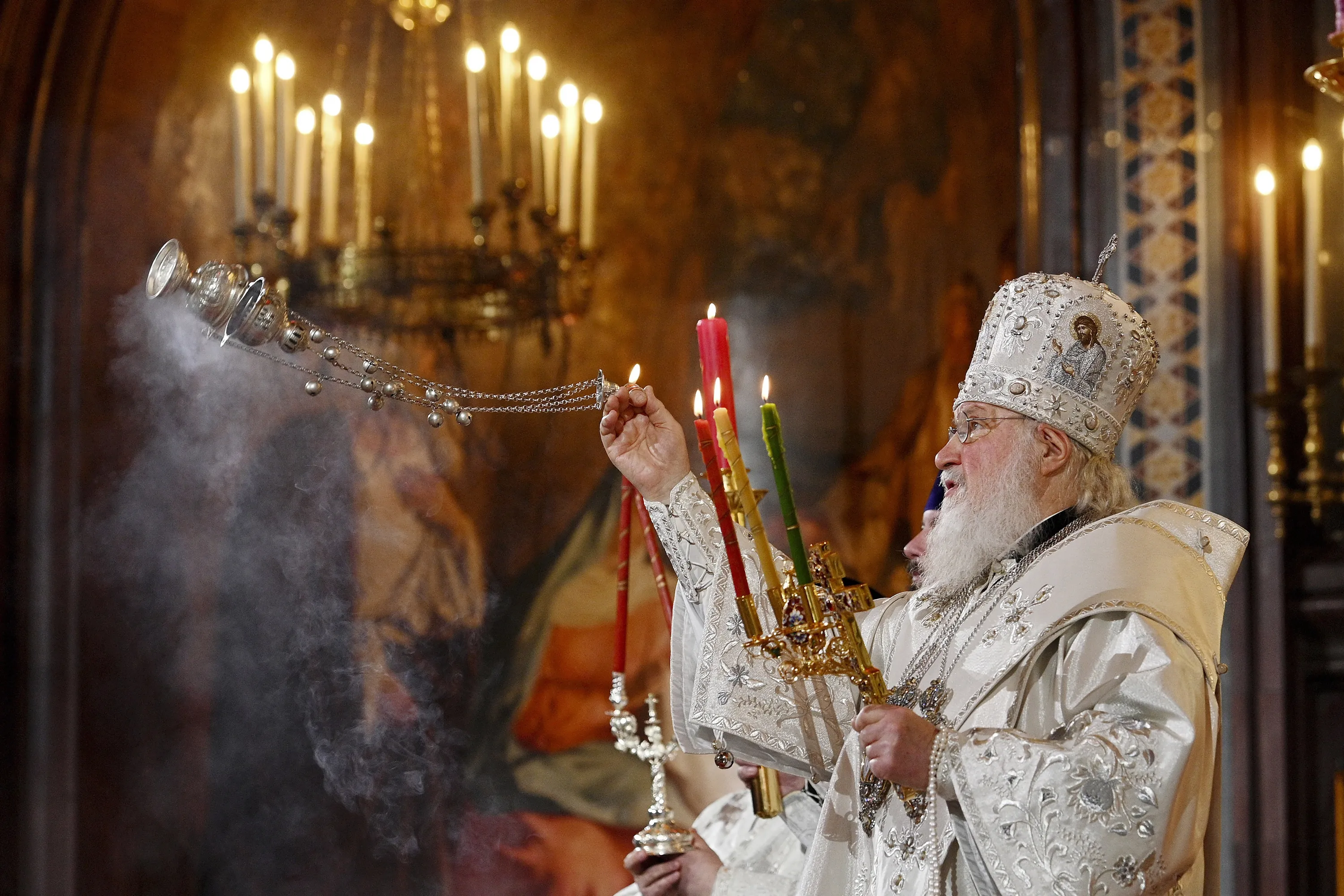 Russian Orthodox Church Patriarch Kirill conducts the church's main service celebrating Orthodox Easter at Moscow's Christ the Savior Cathedral in Moscow, Russia, early Sunday, April 19, 2020. Orthodox priests in much of Europe held Easter services in churches empty of parishioners because of restrictions imposed to block the spread of coronavirus. (Photo by Oleg Varov, Russian Orthodox Church Press Service via AP Photo)