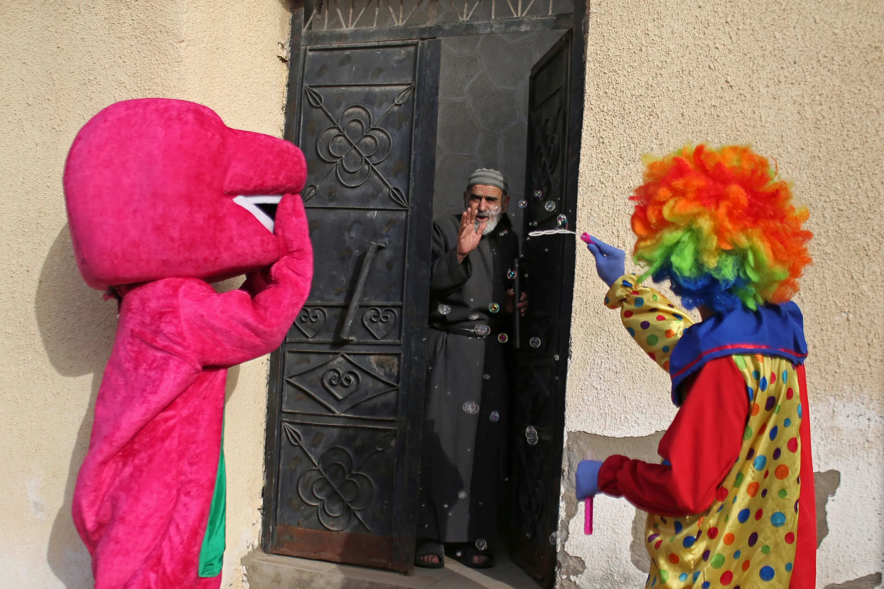 A Palestinian man waves from his home as a clown and a man in a costume perform to entertain people amid concerns about the spread of the coronavirus disease (COVID-19), in Khan Younis in the southern Gaza Strip April 19, 2020. (Photo by Ibraheem Abu Mustafa/Reuters)