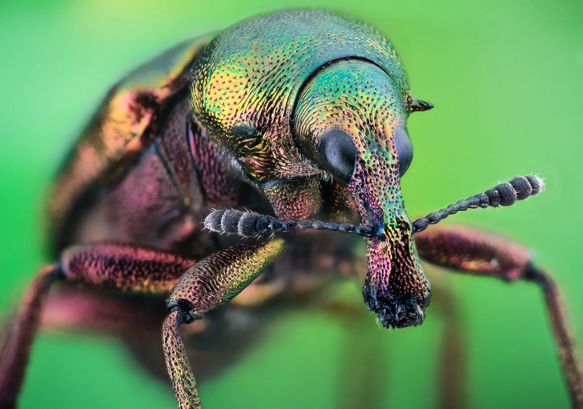 Studio stack: Leaf-roller II. Male leaf-rolling weevil, Byctiscus betulae, Attelabidae. 8 mm.