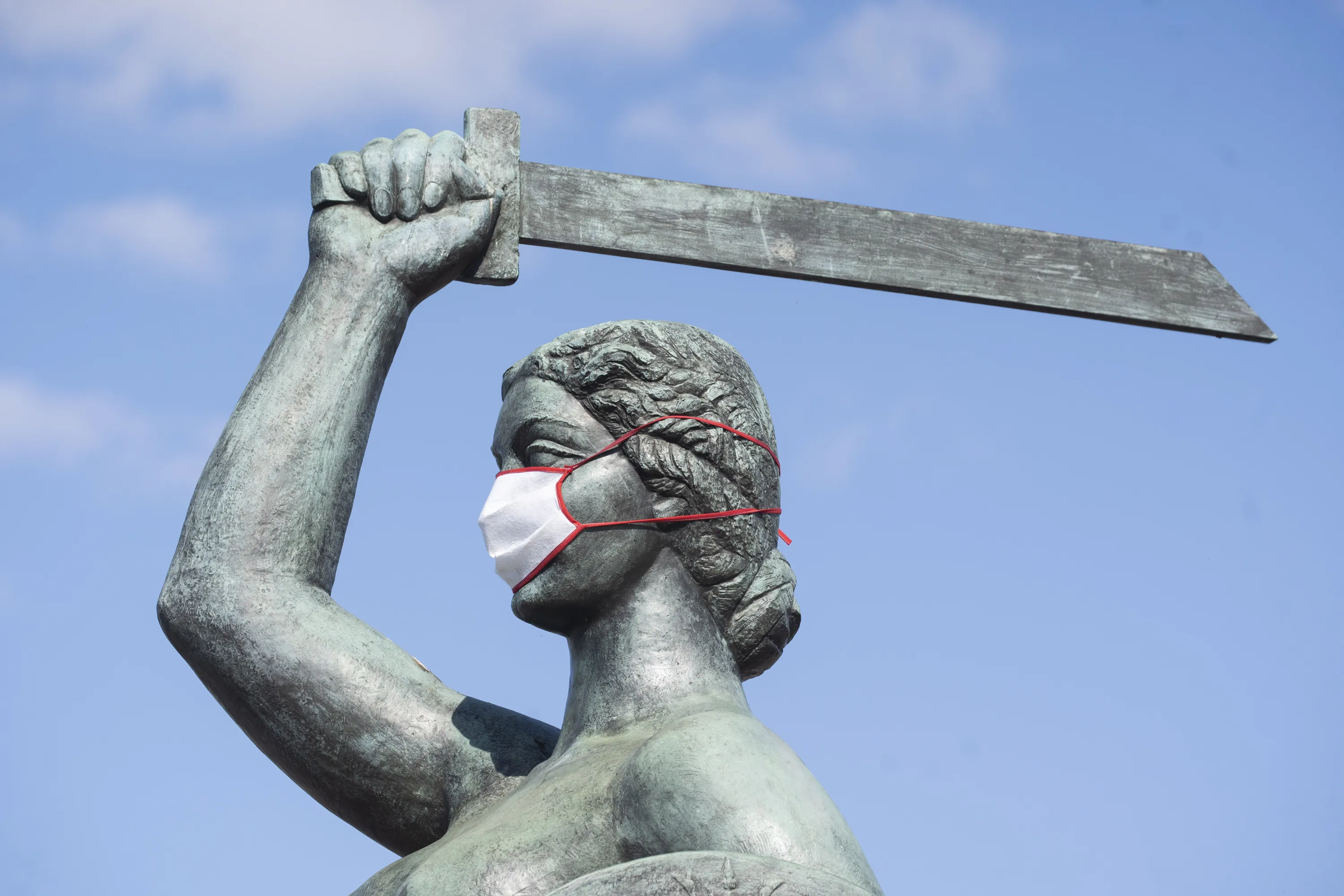 A statue of Siren is seen covered with a face mask in Warsaw, Poland, on April 20, 2020. The Polish government has softened some restrictions associated with the COVID-19 pandemic on Monday, reopening forests and parks to the public and allowing shops to receive more customers on their premises. (Photo by Xinhua News Agency/Rex Features/Shutterstock)