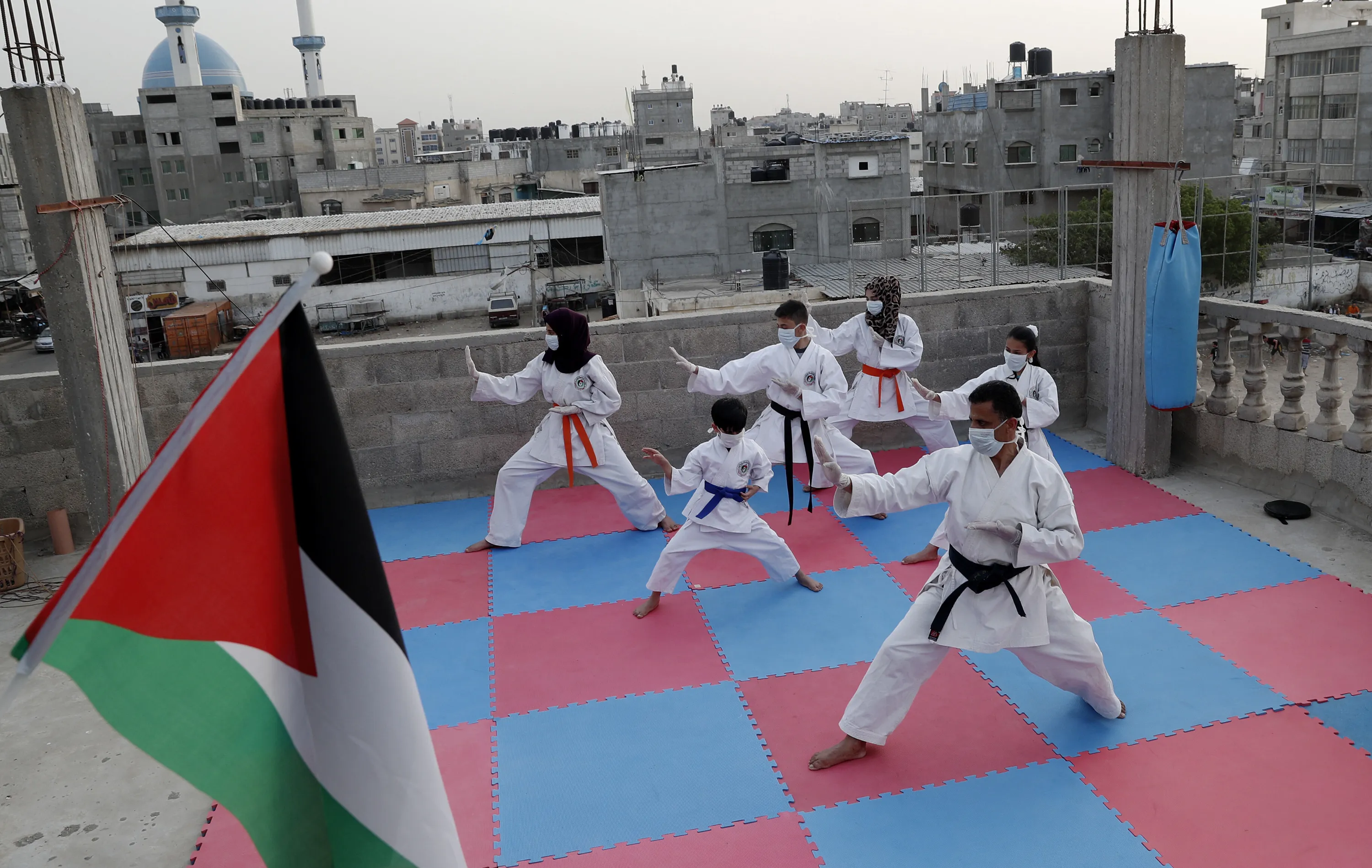 The karate coach of Khaled Sheikh el Eid, front, and his sons and daughters, train together on the roof of their family house, during the coronavirus pandemic, at Rafah refugee camp, southern Gaza Strip, Wednesday, April 22, 2020. (Photo by Adel Hana/AP Photo)