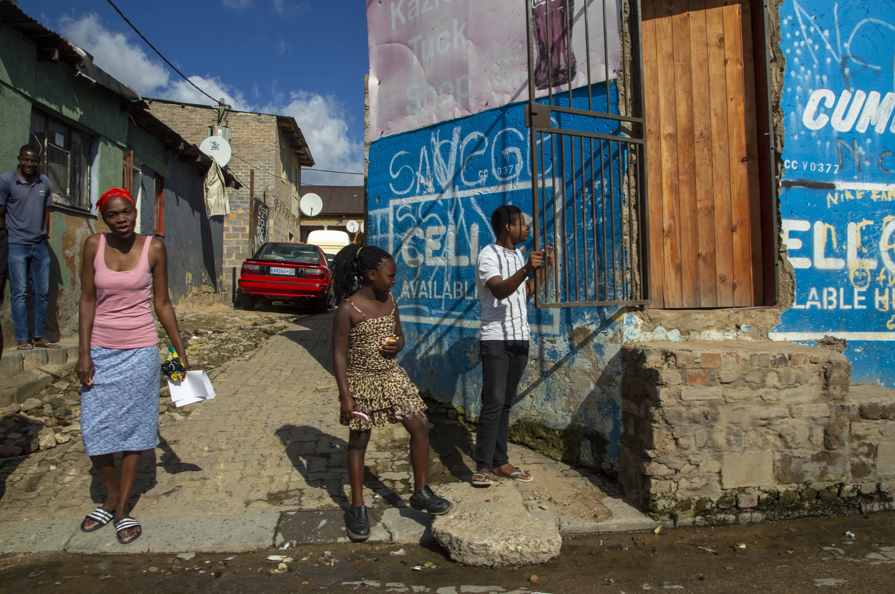 Residents watch as South African National Defence Forces, patrol on the street of a densely populated Alexandra township in Johannesburg, South Africa, Thursday, April 16, 2020. South African President Cyril Ramaphosa extended the lockdown by an extra two weeks in a continuing effort to contain the spread of COVID-19 coronavirus. (Photo by Themba Hadebe/AP Photo)