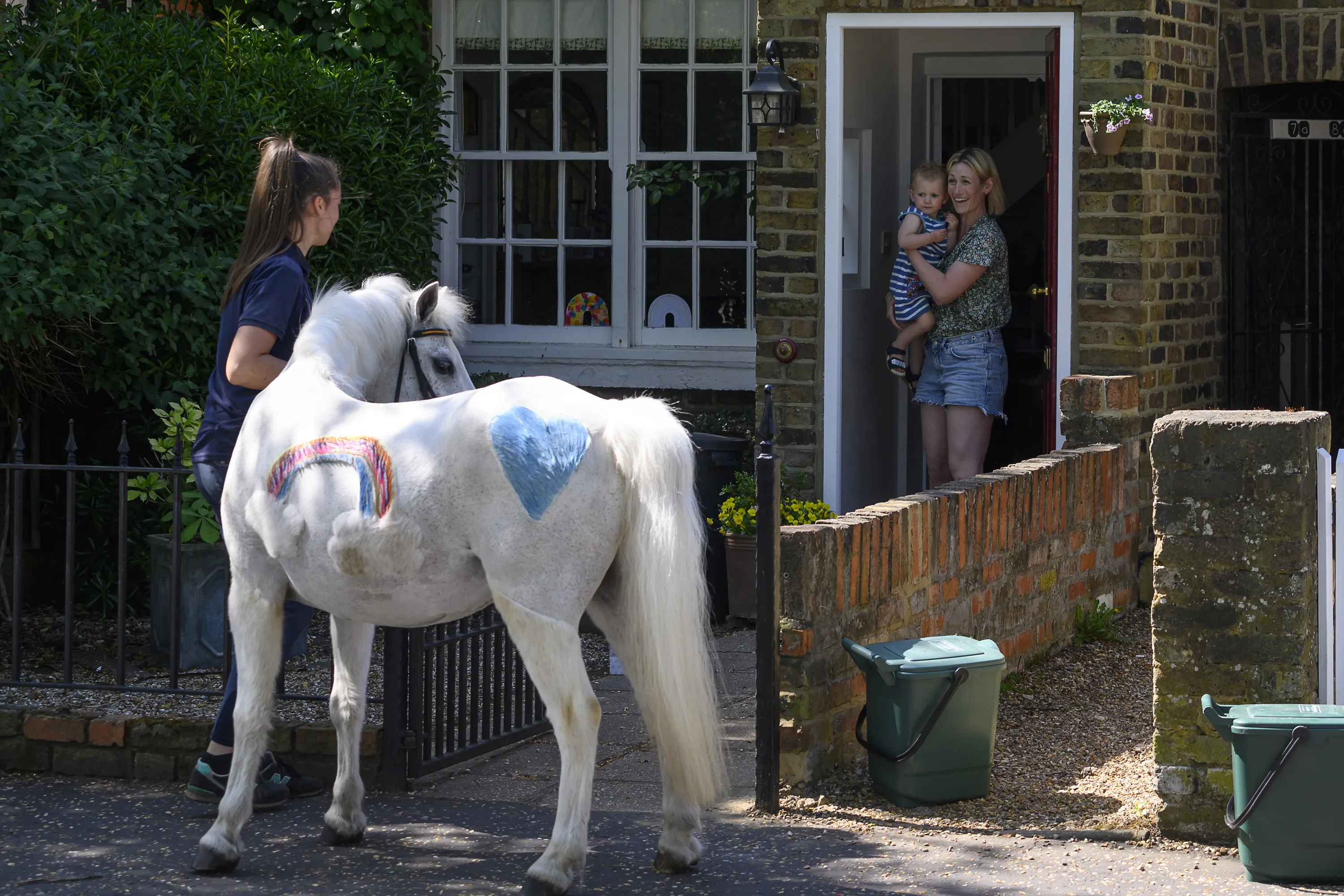 Bryony Blant (R) and daughter Alice (C), who's 2nd birthday it is today, stand on their doorstep looking at Welsh mountain pony Annie's Wizz held by handler Daisy Cinque (L) outside their home in Twickenham, south west London on April 23, 2020. Park Lane Stables are taking the fun to peoples' windows during the novel coronavirus lockdown in an initiative called “Tiny pony at your window”. (Photo by Justin Tallis/AFP Photo)
