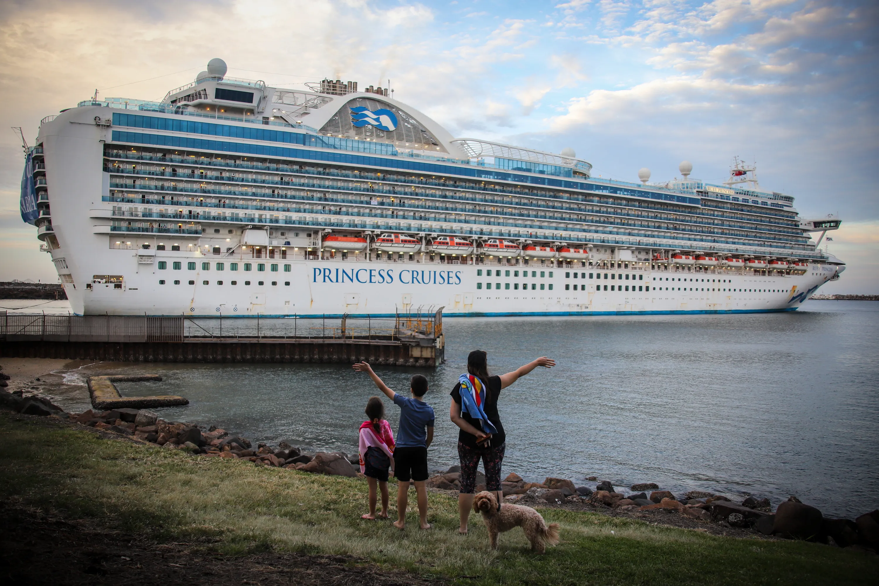 Local people watch the Ruby Princess cruise ship as she departs Port Kembla on April 23, 2020 in Wollongong, Australia. Australian Border Force has ordered the Ruby Princess to depart Australian waters today, as two separate inquiries continue over how the ship's 2700 passengers were allowed to disembark in Sydney in March without adequate health checks during the coronavirus (COVID-19) pandemic. A special commission of inquiry has been established by the NSW government over the handling of the Ruby Princess' arrival into Sydney on 19 March, while NSW Police are also conducting a separate criminal investigation. There are now 21 deaths linked to the Ruby Princess along with more than 600 confirmed coronavirus (COVID-19) cases. (Photo by James D. Morgan/Getty Images)