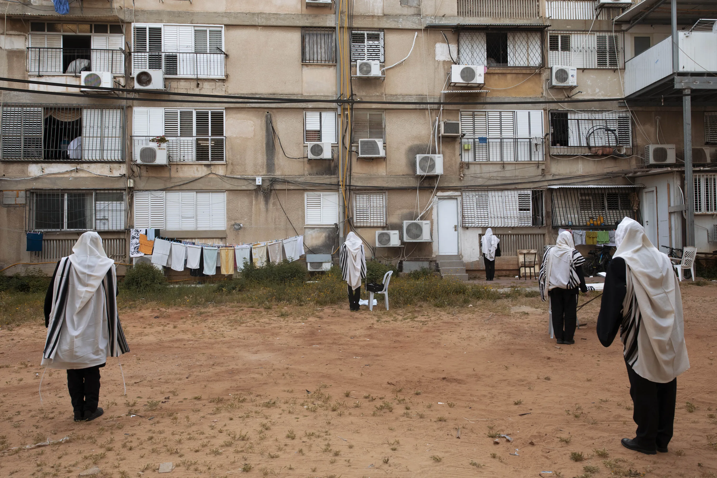 Ultra-Orthodox Jews keep social distancing during a morning prayer next to their houses as synagogues are closed following the government's measures to help stop the spread of the coronavirus, in Bnei Brak, Israel, Friday, April 24, 2020. (Photo by Oded Balilty/AP Photo)