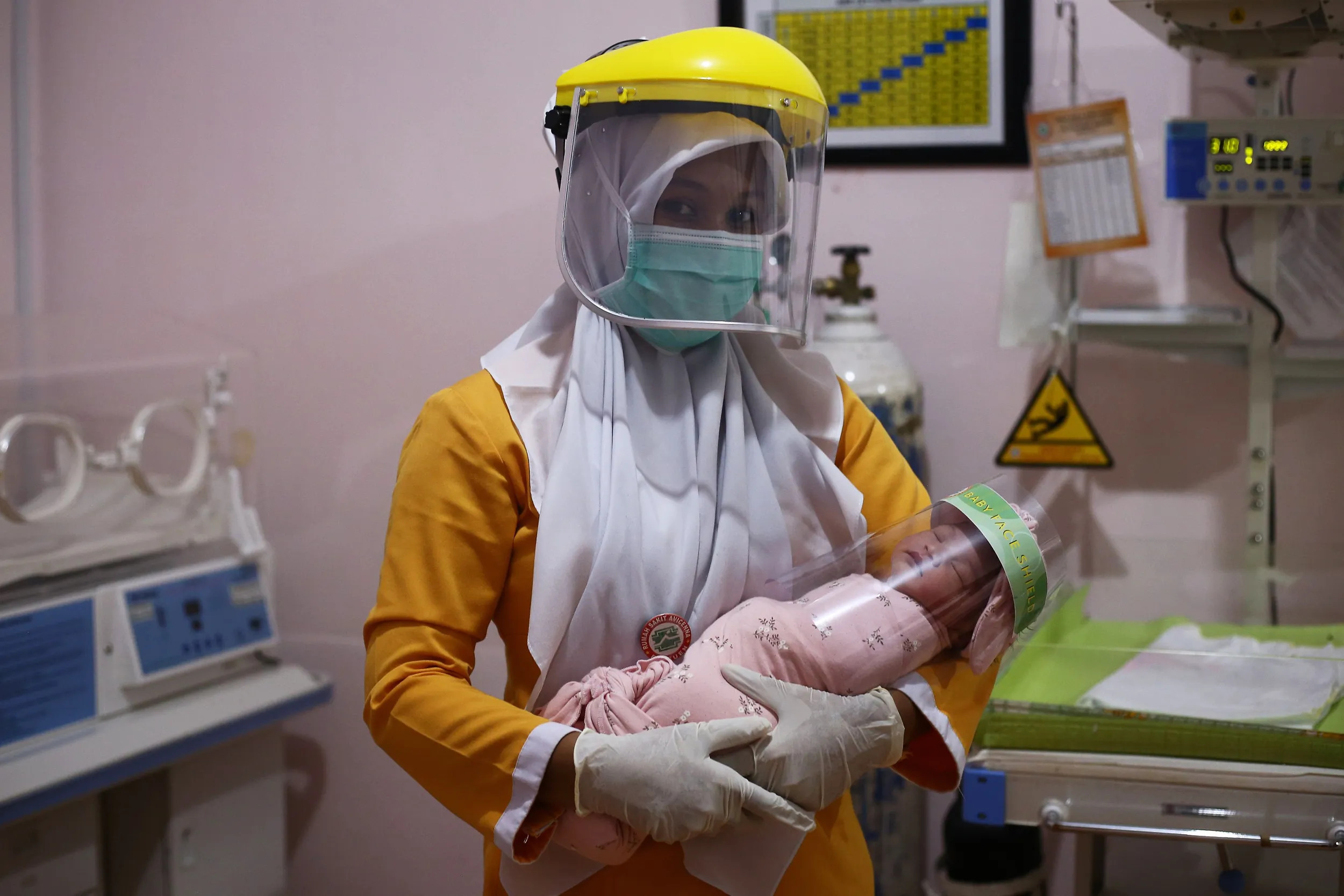 An Indonesian nurse wearing protective gear holds a newborn baby wearing a face shield as a protective measure amid the COVID-19 coronavirus pandemic at a clinic in Bireuen, Aceh province on April 15, 2020. (Photo by Amanda Jufrian/AFP Photo)