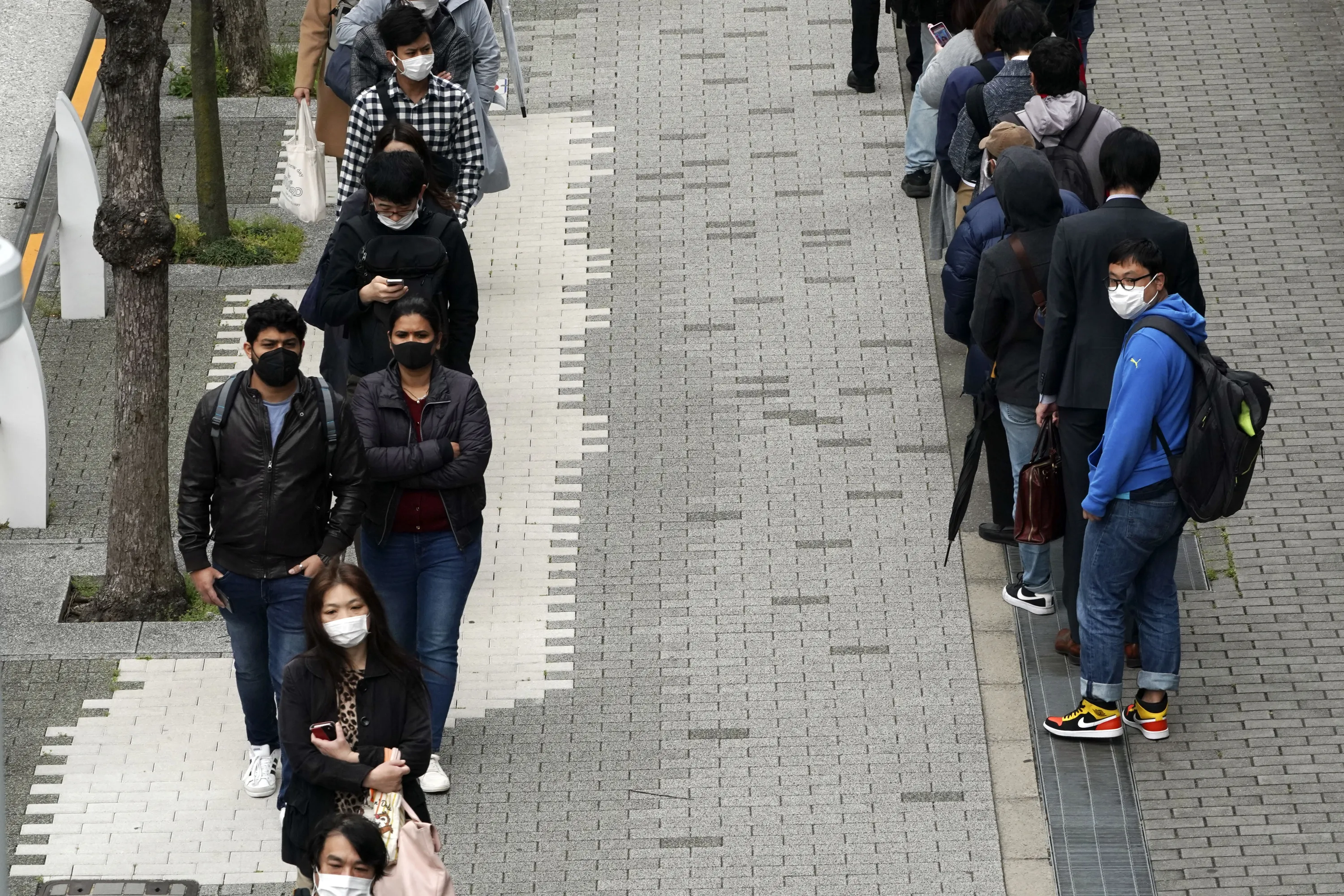Commuters with face masks against the spread of the new coronavirus wait for buses during a rush hour in Tokyo Monday, April 27, 2020. Japan's Prime Minister Shinzo Abe expanded a state of emergency to all of Japan from just Tokyo and other urban areas as the virus continues to spread. (Photo by Eugene Hoshiko/AP Photo)
