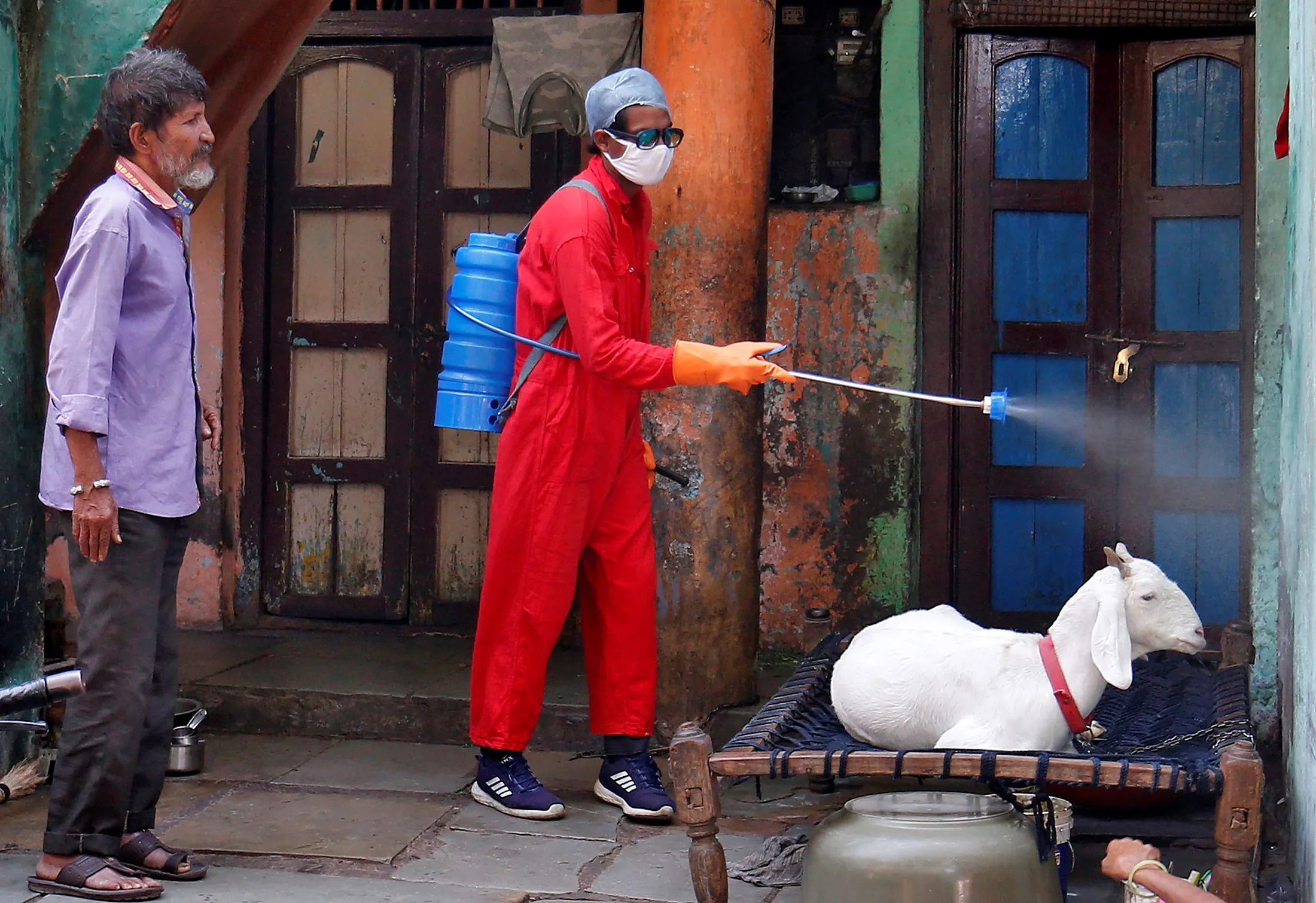 A municipal worker sprays disinfectant on a goat at a residential area during a nationwide lockdown to slow the spreading of coronavirus disease (COVID-19), in Ahmedabad, India, April 26, 2020. (Photo by Amit Dave/Reuters)