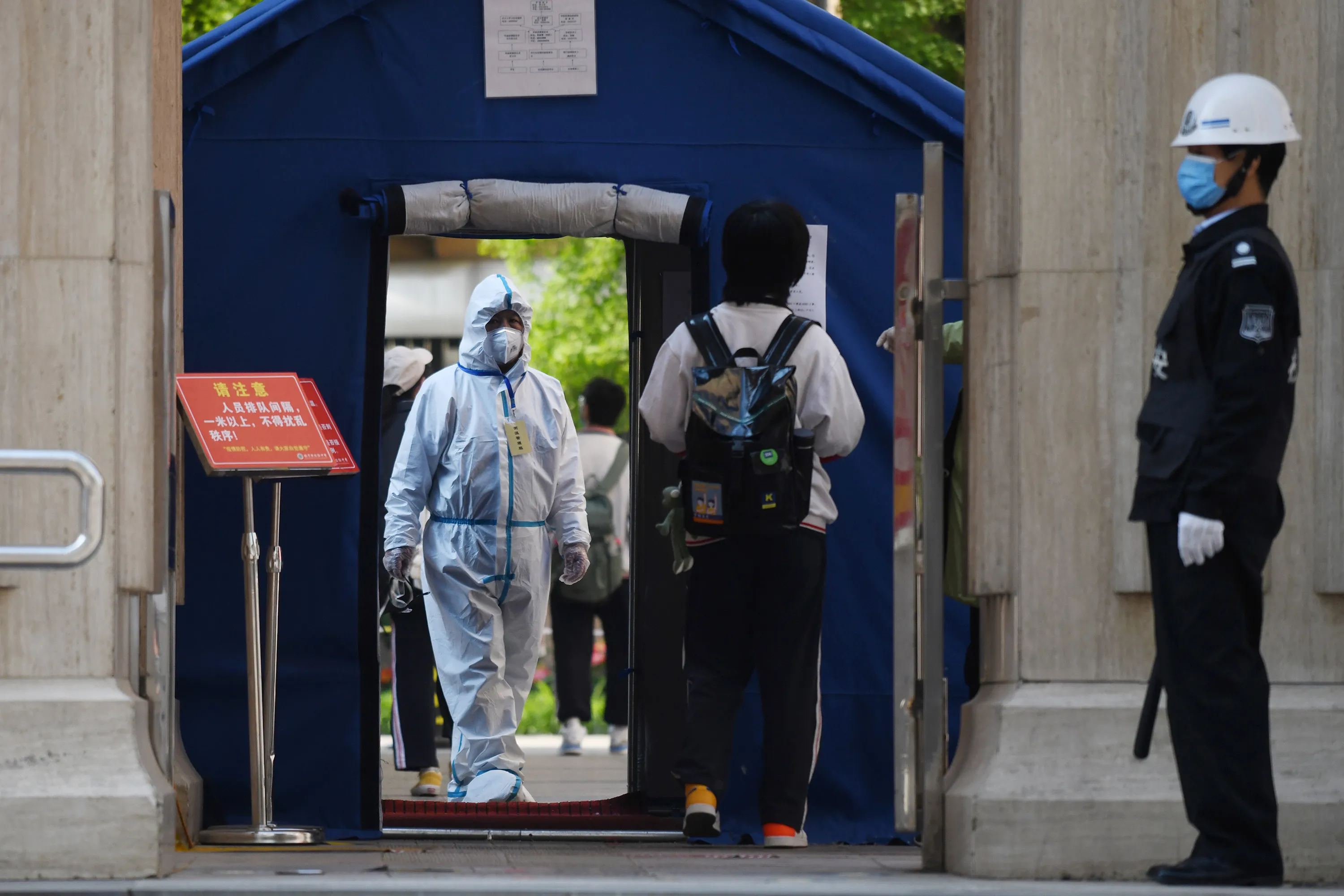 An official in a hazmat suit waits inside a high school entrance as a student arrives in Beijing on April 27, 2020. Senior students returned to class for the first time since schools were closed down in January as part of efforts to stop the spread of the COVID-19 coronavirus. (Photo by Greg Baker/AFP Photo)