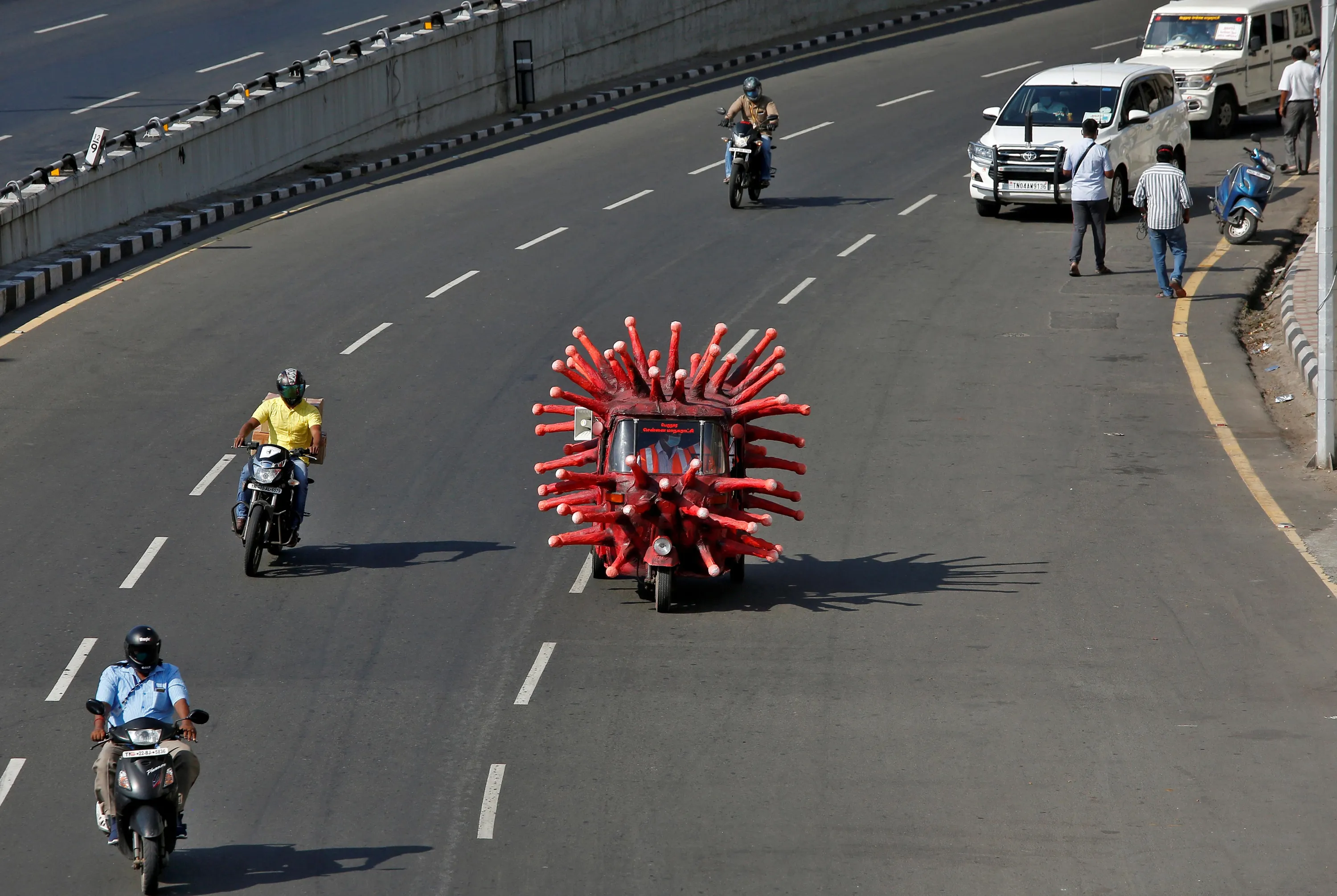 A man drives an auto-rickshaw depicting the coronavirus to create awareness about staying at home during a nationwide lockdown to slow the spreading of the coronavirus disease (COVID-19), in Chennai, April 23, 2020. (Photo by P. Ravikumar/Reuters)