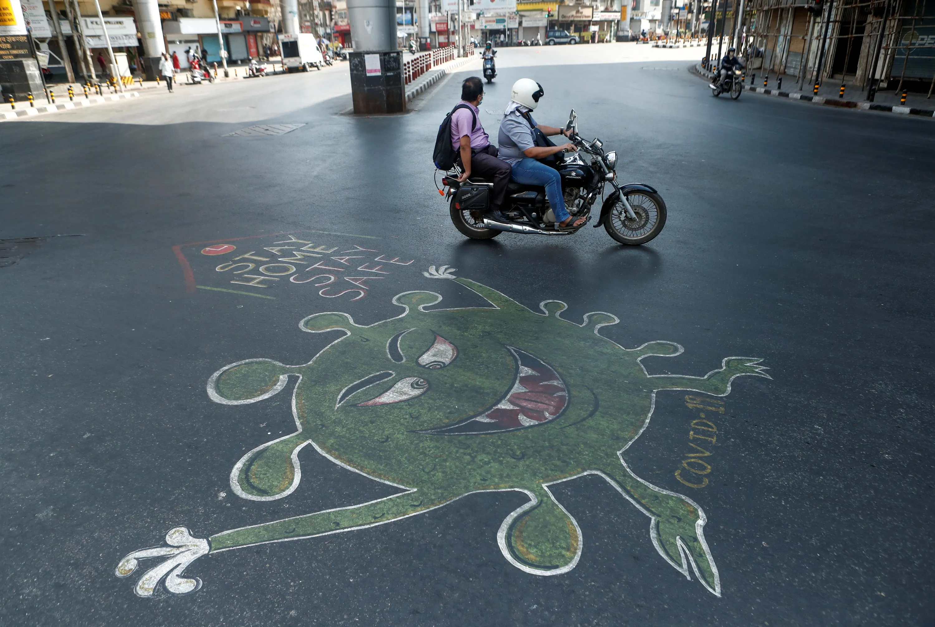 People ride past a graffiti on a road depicting the coronavirus, as an attempt to raise awareness about the importance of staying at home during a nationwide lockdown to slow the spreading of the coronavirus disease (COVID-19), in Mumbai, April 20, 2020. (Photo by Francis Mascarenhas/Reuters)