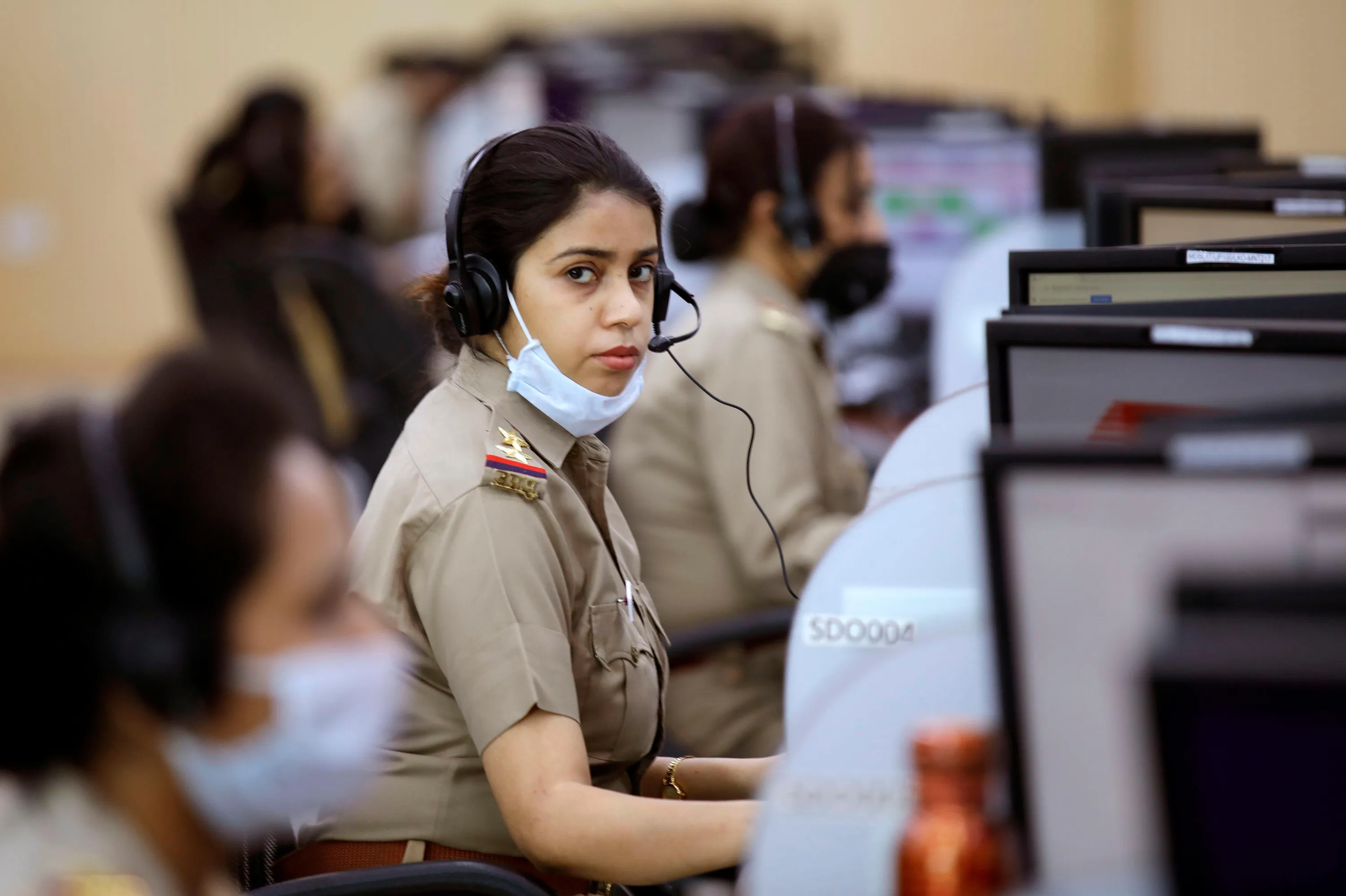Police officers wearing protective masks work inside a call centre run by Uttar Pradesh state police during an extended lockdown to slow the spreading of coronavirus disease (COVID-19) in Lucknow, April 21, 2020. (Photo by Pawan Kumar/Reuters)