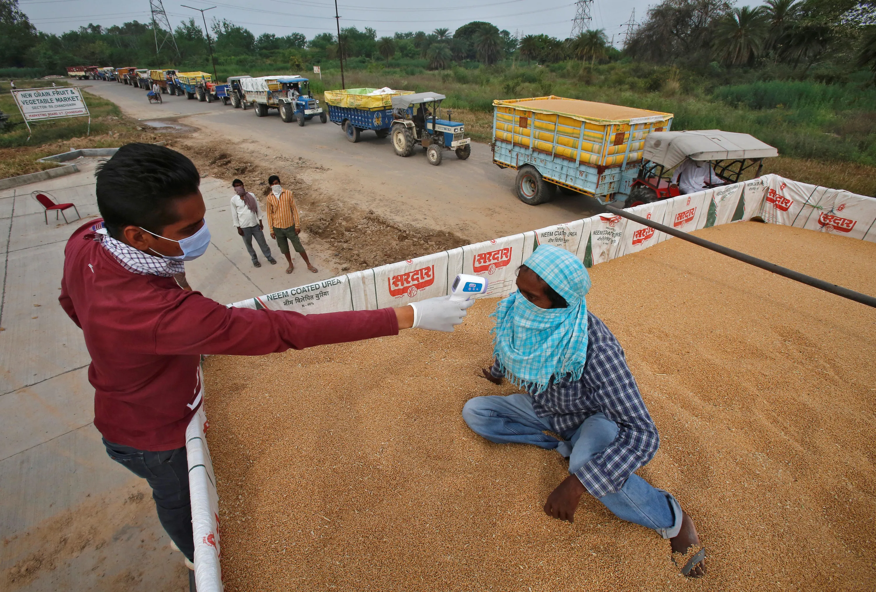A health worker uses an infrared thermometer to check the temperature of a labourer sitting on wheat crop in a tractor trolley at an entry gate of a wholesale grain market, during a nationwide lockdown to slow the spreading of coronavirus disease (COVID-19) in Chandigarh, April 20, 2020. (Photo by Ajay Verma/Reuters)