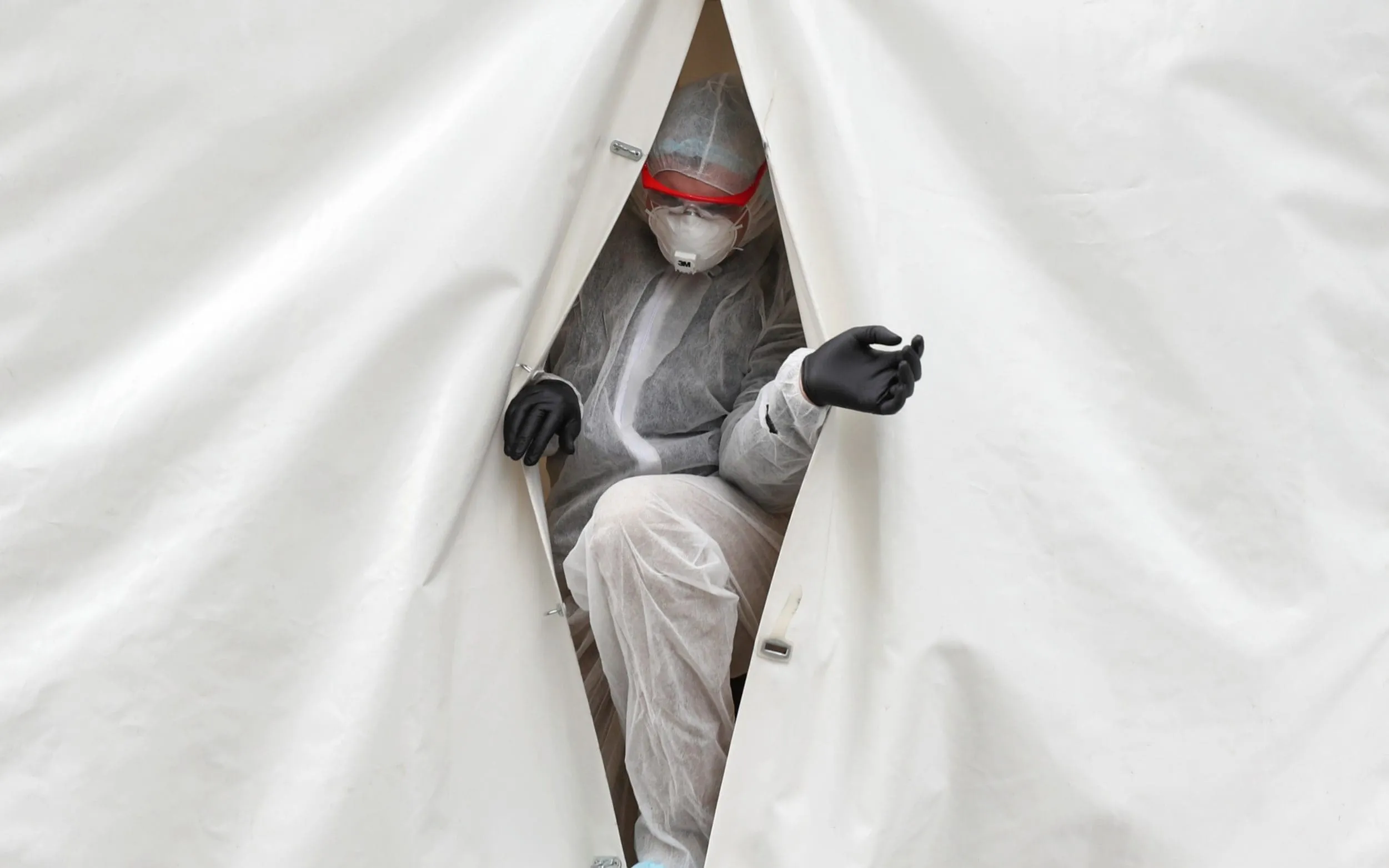A medical specialist walks out of a mobile laboratory, which carries out tests to detect the coronavirus disease (COVID-19) near the Moscow International Business Centre, also known as “Moskva-City”, in Moscow, Russia on April 27, 2020. (Photo by Evgenia Novozhenina/Reuters)