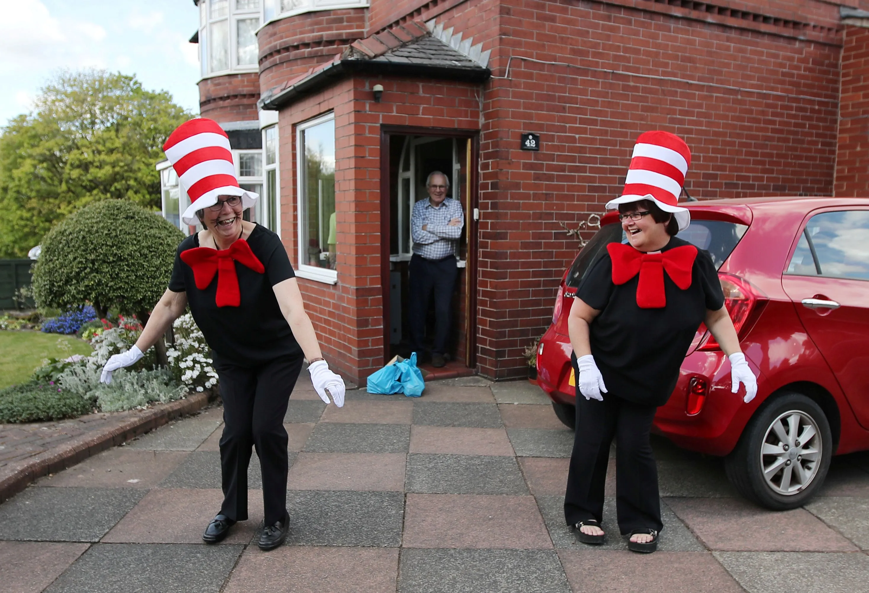 Viv and Carol from St James' church, dressed as the character Cat in the Hat, pose for a photograph as they deliver meals to vulnerable residents following the outbreak of the coronavirus disease (COVID-19), Bolton, Britain, April 27, 2020. (Photo by Molly Darlington/Reuters)