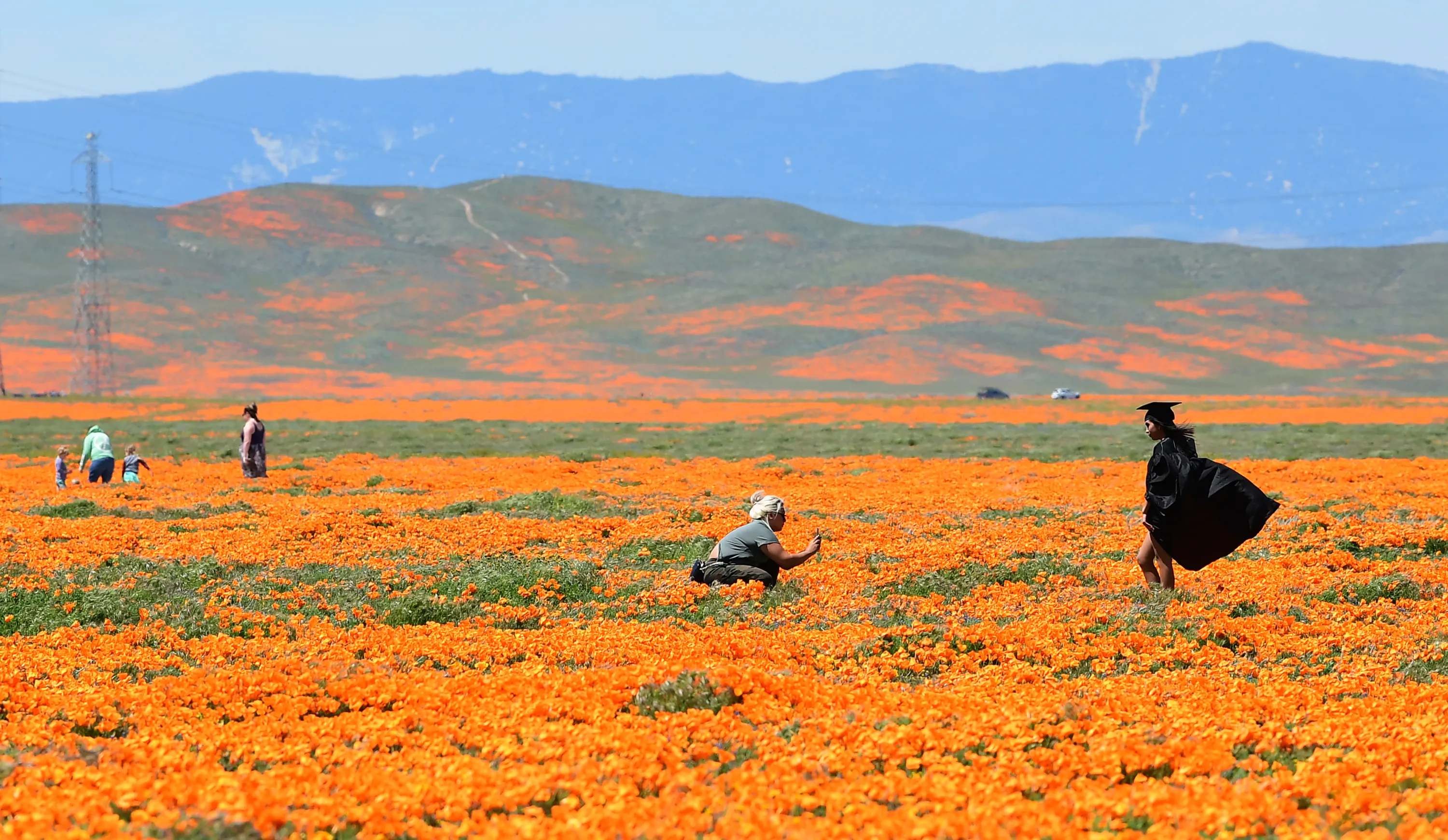 A girl poses in the cap and gown of her graduation outfit in poppy fields near the Antelope Valley California Poppy Reserve on April 16, 2020 in Lancaster, California where the annual spring bloom is underway. This year's bloom is being live-streamed as park grounds remain closed since late March due to the coronavirus pandemic. (Photo by Frederic J. Brown/AFP Photo)