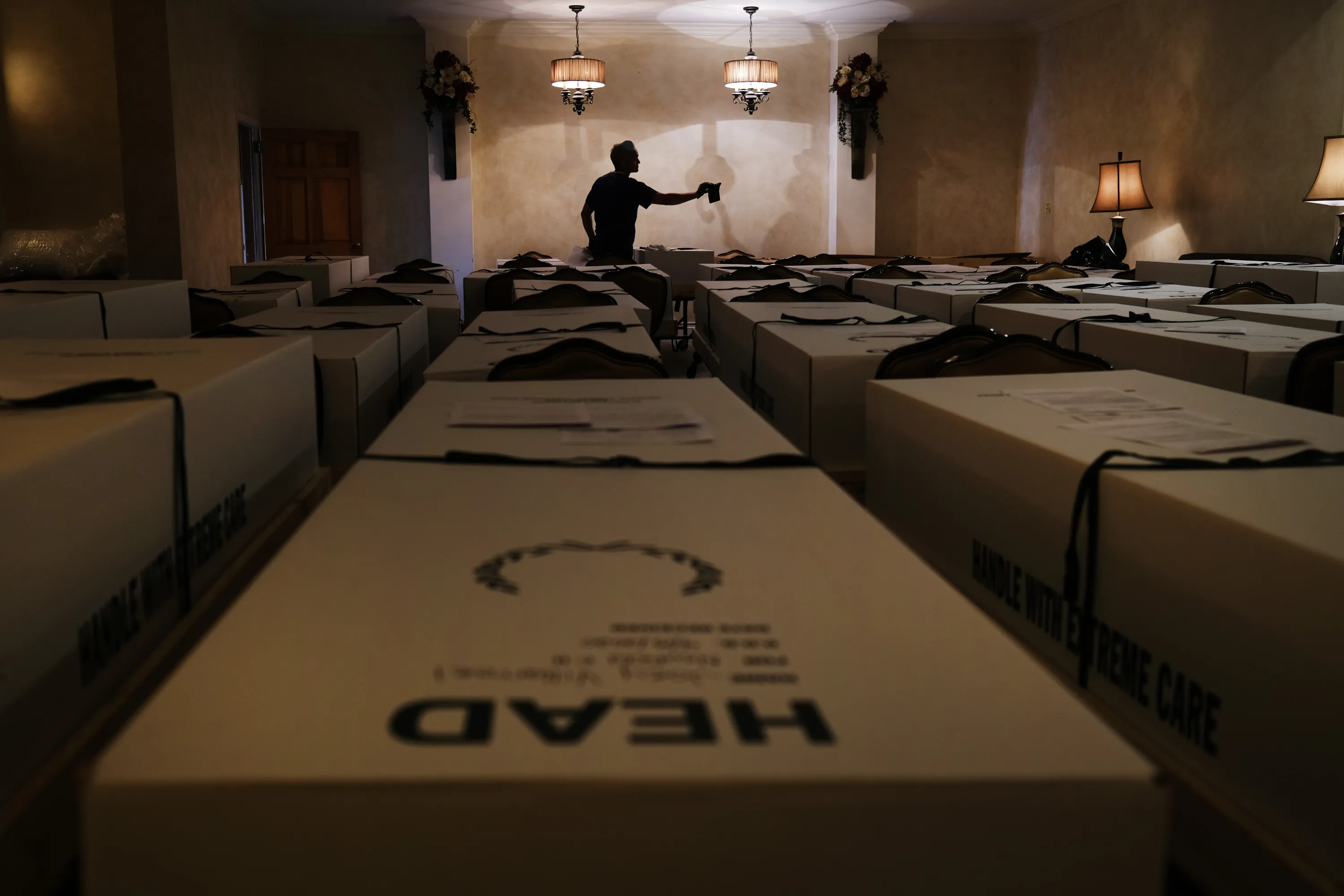 Omar Rodriguez organizes bodies in the Gerard Neufeld funeral home on April 22, 2020 in the Elmhurst neighborhood of the Queens borough in New York City. The decades old funeral home, that now primarily serves an immigrant community in Queens that has been hit hard by coronavirus, has been overwhelmed by the number of deceased needing their funeral services because of the virus. Before COVID-19, the funeral home handled an average of seven or eight bodies per week and now are seeing over forty. The Queens community has been one of the most devastated communities in America and the world by COVID-19 (Photo by Spencer Platt/Getty Images)