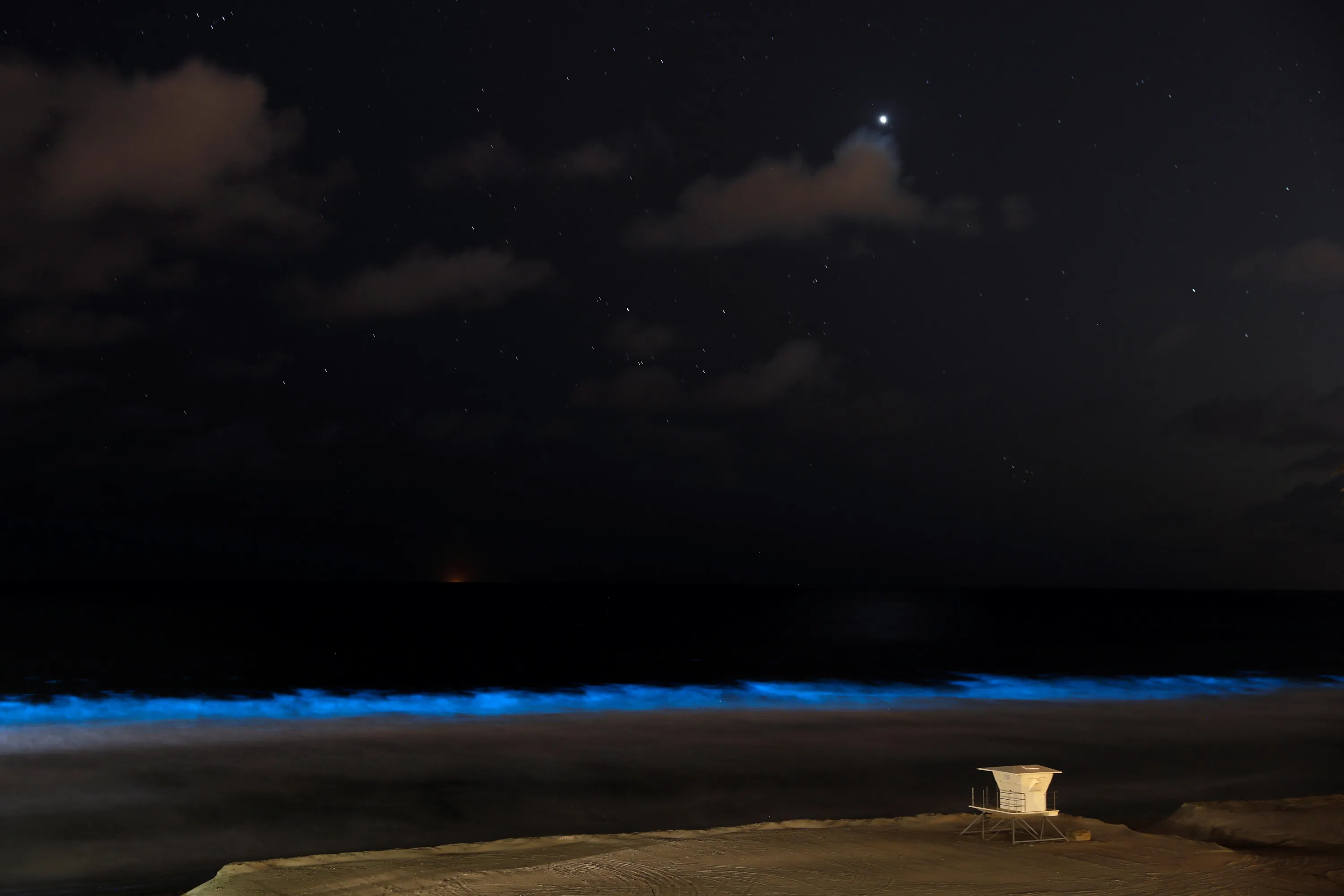Bioluminescent algae glows in the crashing waves as a lifeguard tower sits on an empty beach during the outbreak of the coronavirus disease (COVID-19) in Encinitas, California, U.S., April 18, 2020. Picture taken with long exposure. (Photo by Mike Blake/Reuters)