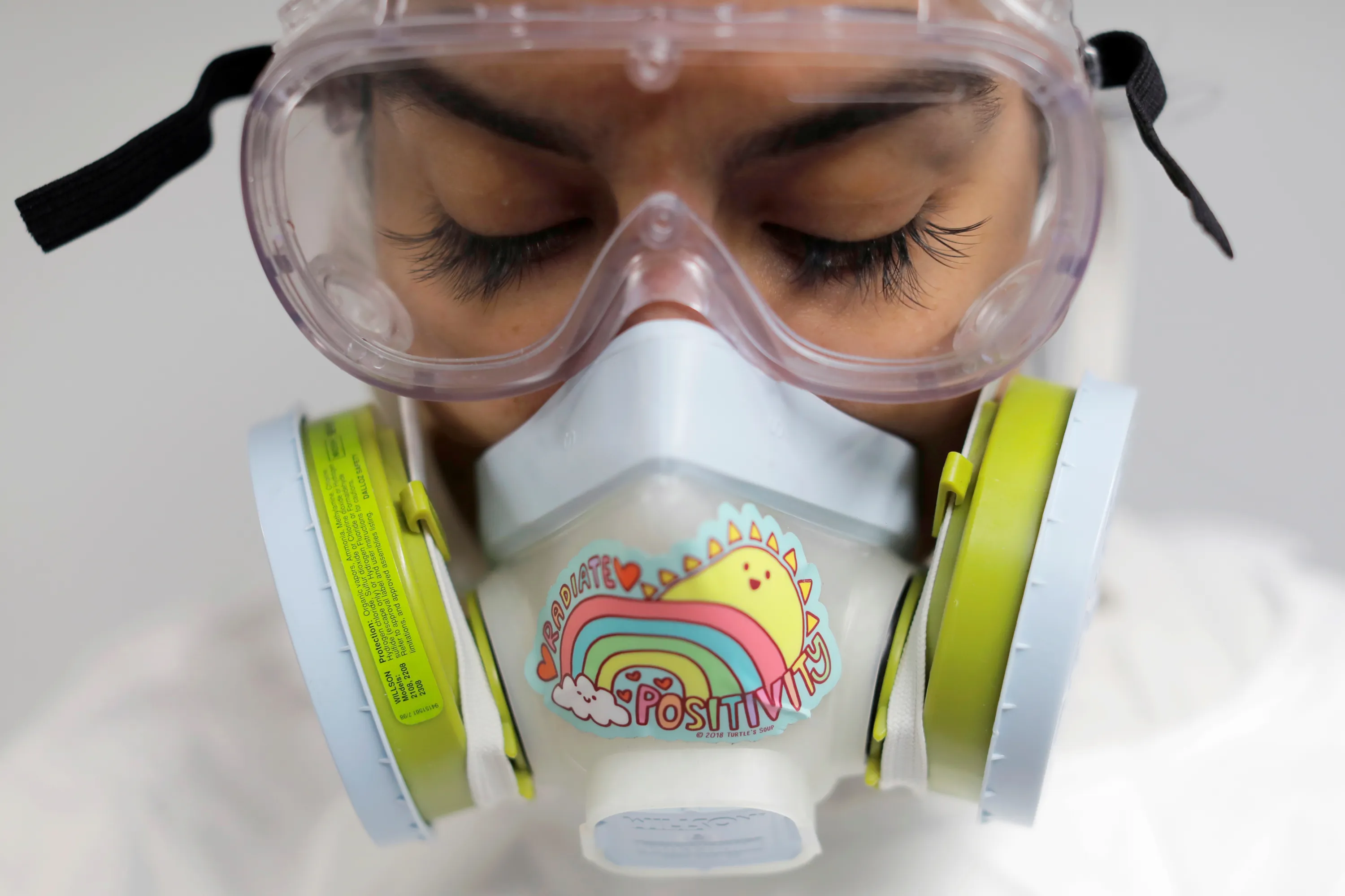 Alisha Narvaez, 36, the manager at International Funeral & Cremation Services, a funeral home in Harlem, poses for a photo in her personal protective equipment, before embalming a deceased person, during the coronavirus disease (COVID-19) outbreak, in Manhattan, New York City, New York, U.S., April 9, 2020. At the beginning of the pandemic, Narvaez sent her 17-year-old daughter to live with her twin sister, but after two weeks the distance was too much. “It's always just been me and her and she wanted to come home”, said Narvaez. “I gotta make sure I keep healthy just not to harm her”, she added. “Although she's been in quarantine for several weeks, every day I come home from work is Day Zero for her”. (Photo by Andrew Kelly/Reuters)