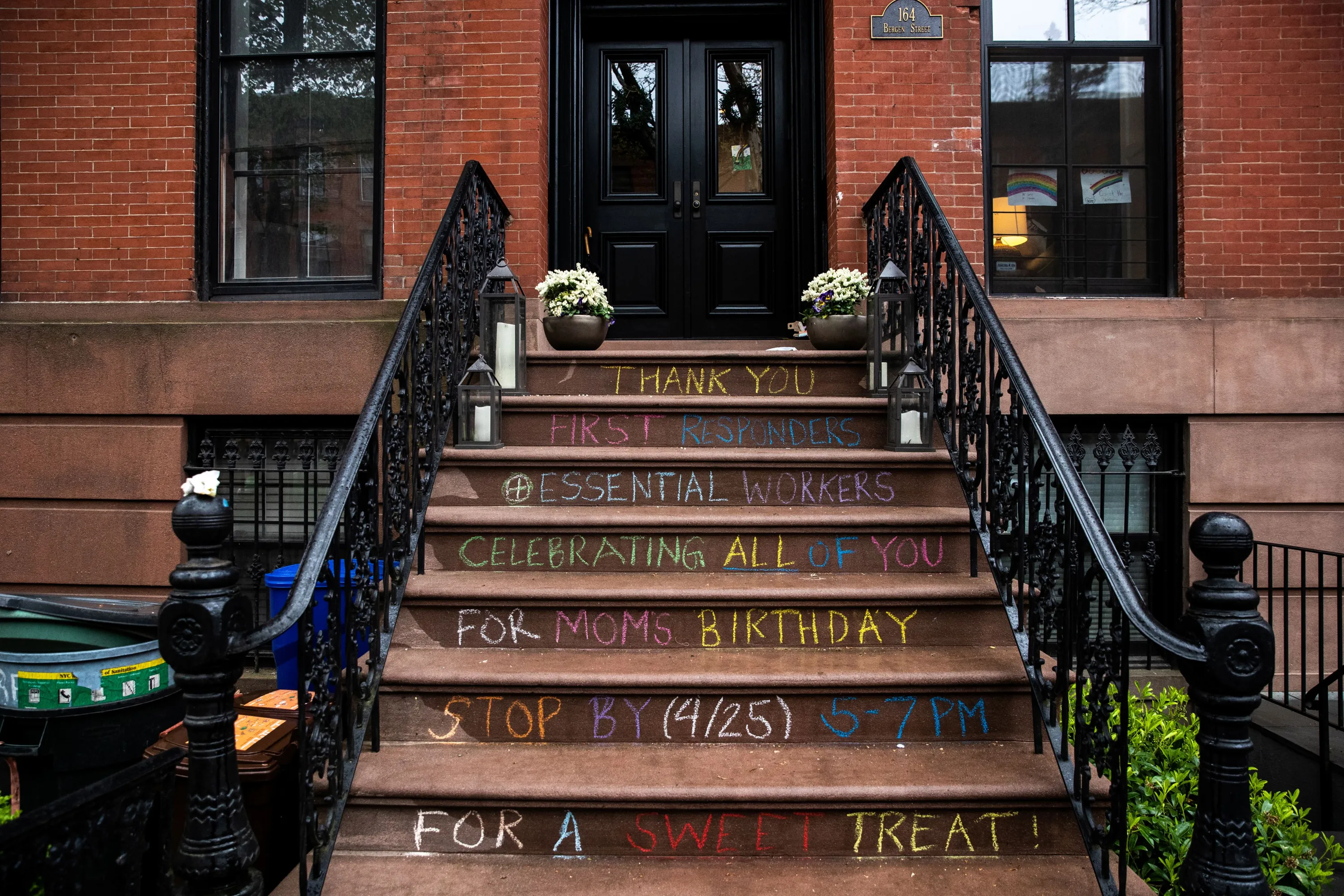A thank you sign is seen outside a staircase during the outbreak of the coronavirus disease (COVID-19) in the Brooklyn borough of New York City, U.S., April 26, 2020. (Photo by Jeenah Moon/Reuters)