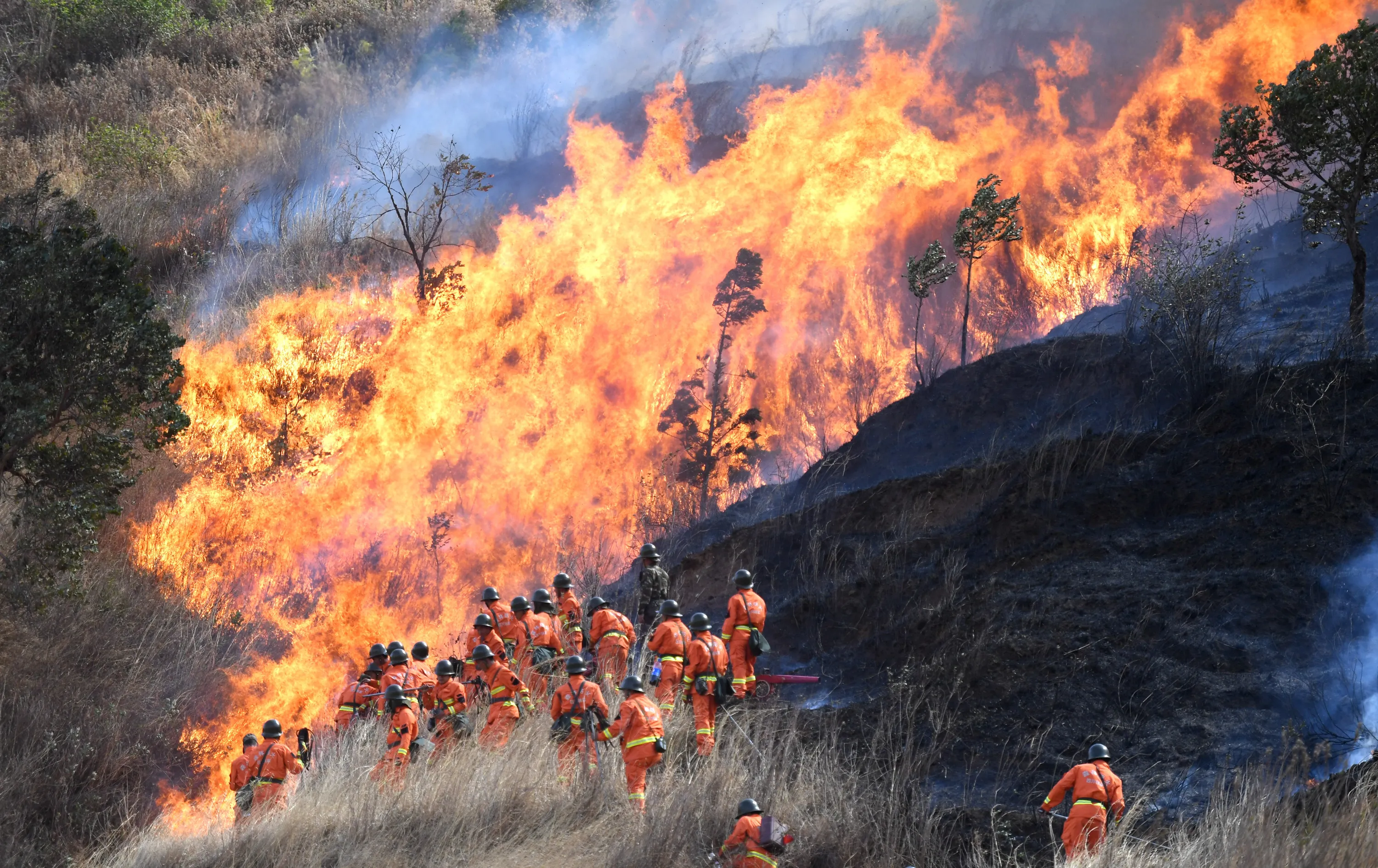 Fire fighters work to control a blaze in Sichuan province, Xichang, China on April 20, 2020. (Photo by Top Photo Corporation/Rex Features/Shutterstock)