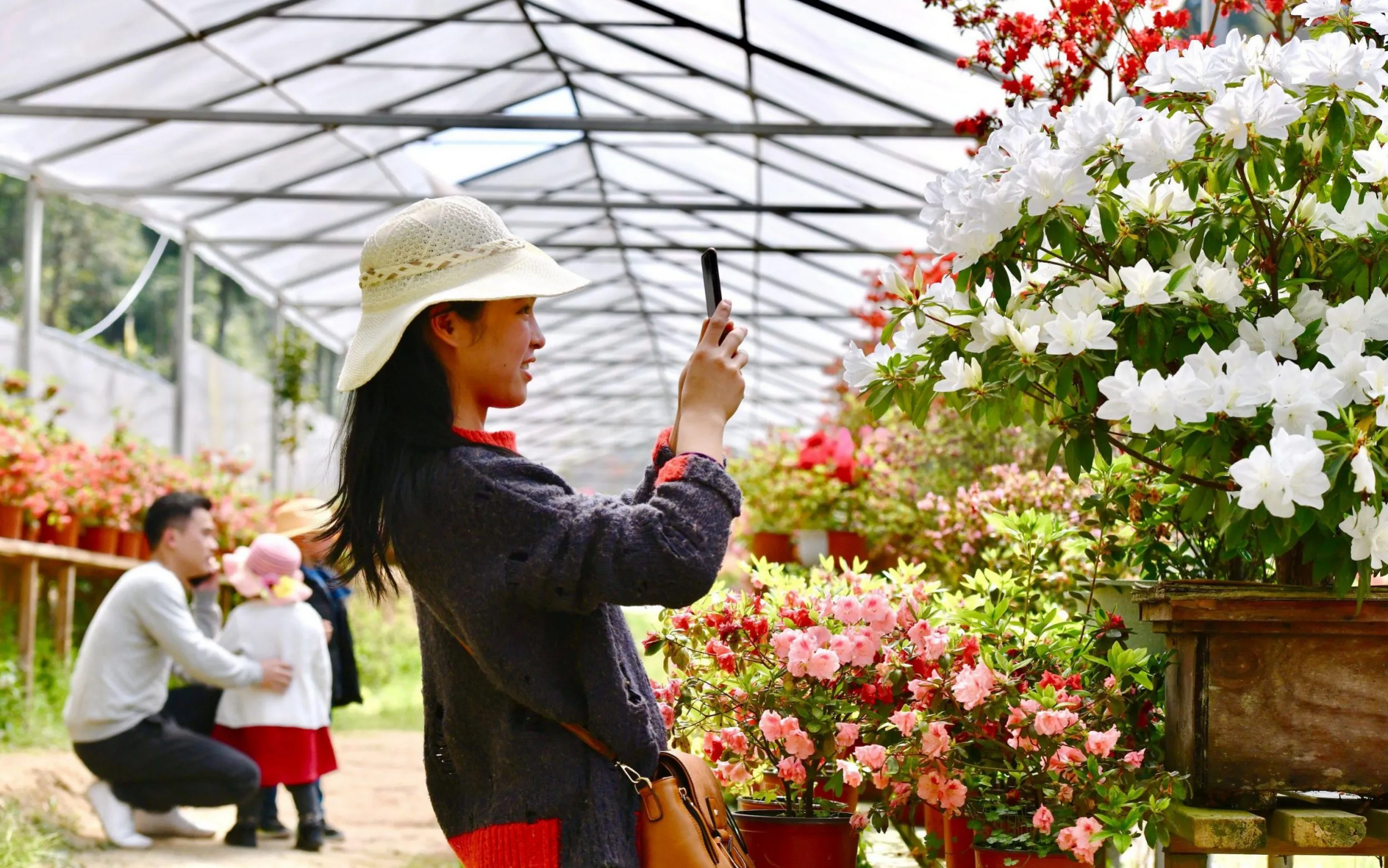 A visitor takes photos of potted flowers at the Tianlanlan flower cultivation base in Zhouning County, southeast China on April 18, 2020. (Photo by Xinhua News Agency/Alamy Live News)
