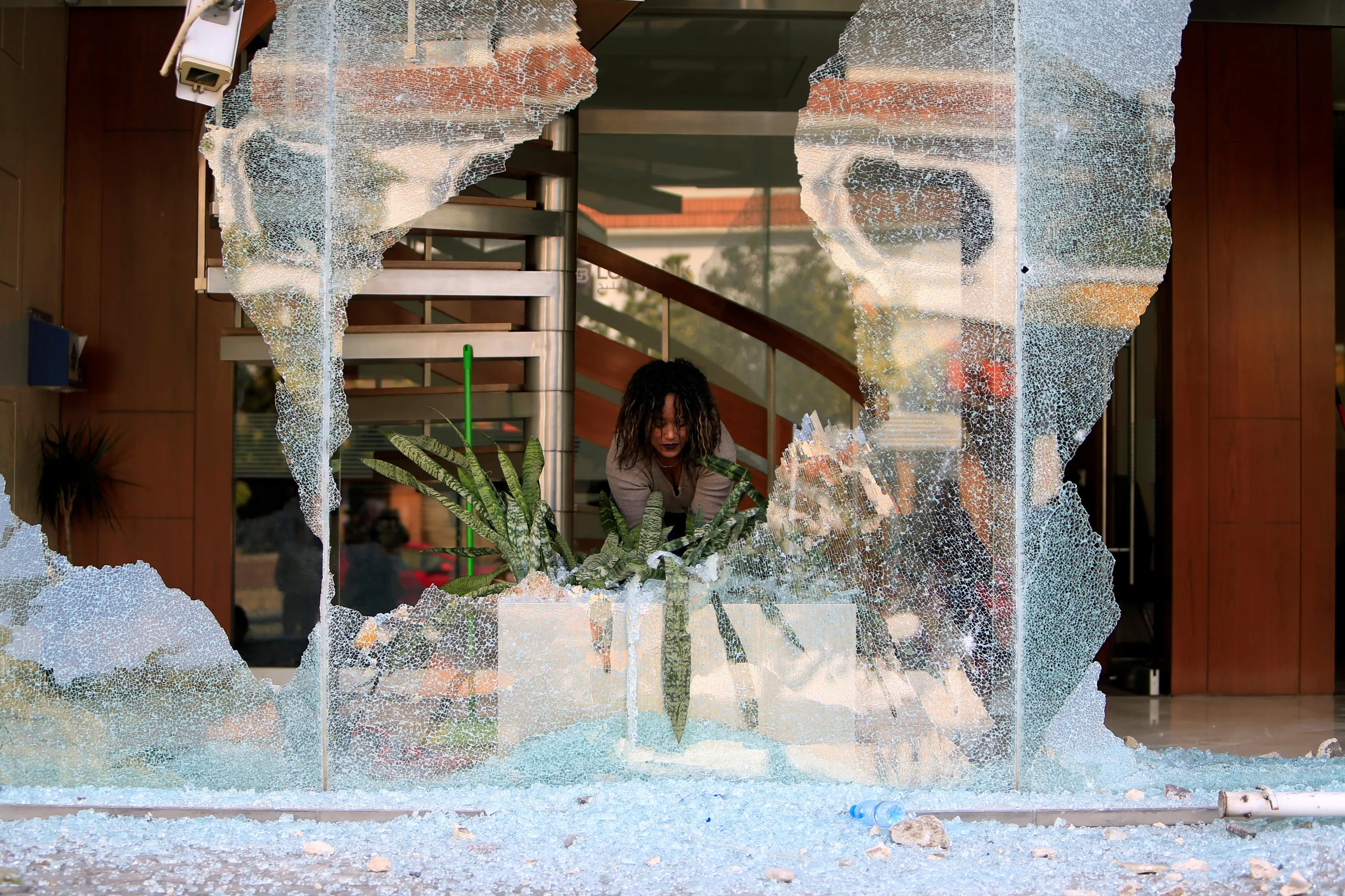 A worker cleans up broken glass from a bank facade after overnight protests against growing economic hardship in Sidon, Lebanon April 29, 2020. (Photo by Ali Hashisho/Reuters)