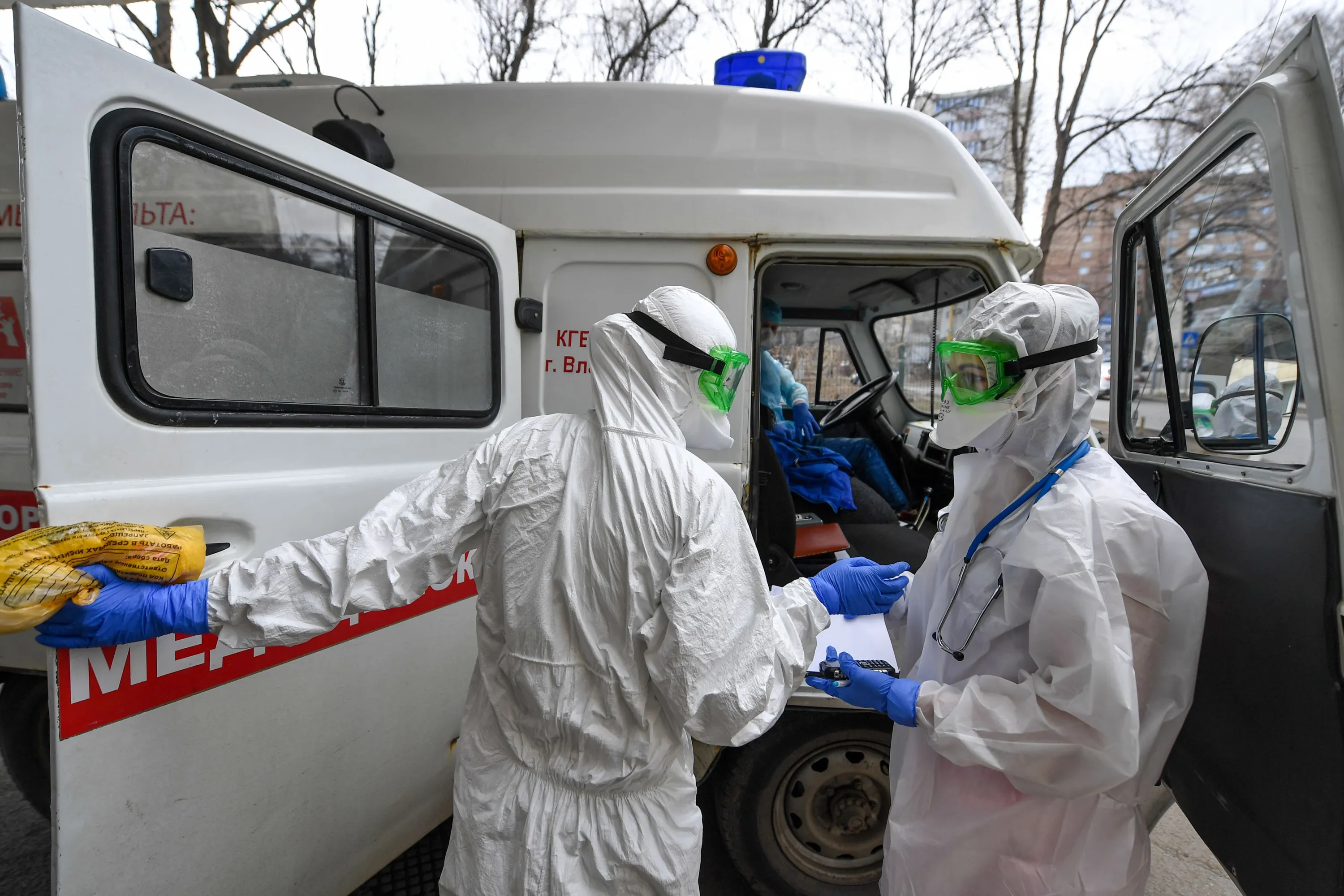 Emergency paramedics ahead of a house call at the Vladivostok medical emergency service in Vladivostok, Russia on April 23, 2020 during the ongoing COVID-19 coronavirus pandemic. (Photo Yuri Smityuk/TASS)