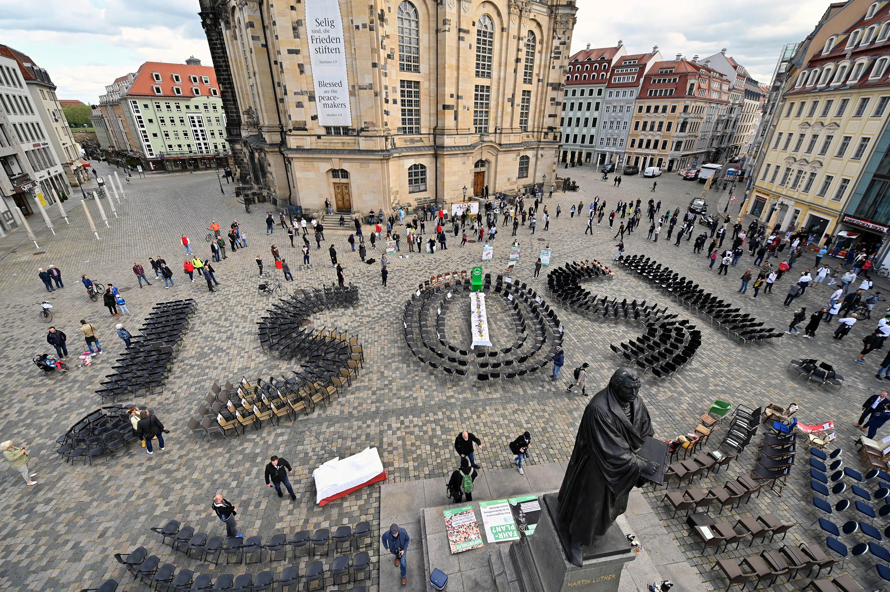 Empty chairs arranged to display “SOS” are placed at the Neumarkt square to call attention to the difficult situation of hotel and restaurant owners, as the spread of the coronavirus disease (COVID-19) continues in Dresden, Germany, May 1, 2020. (Photo by Matthias Rietschel/Reuters)