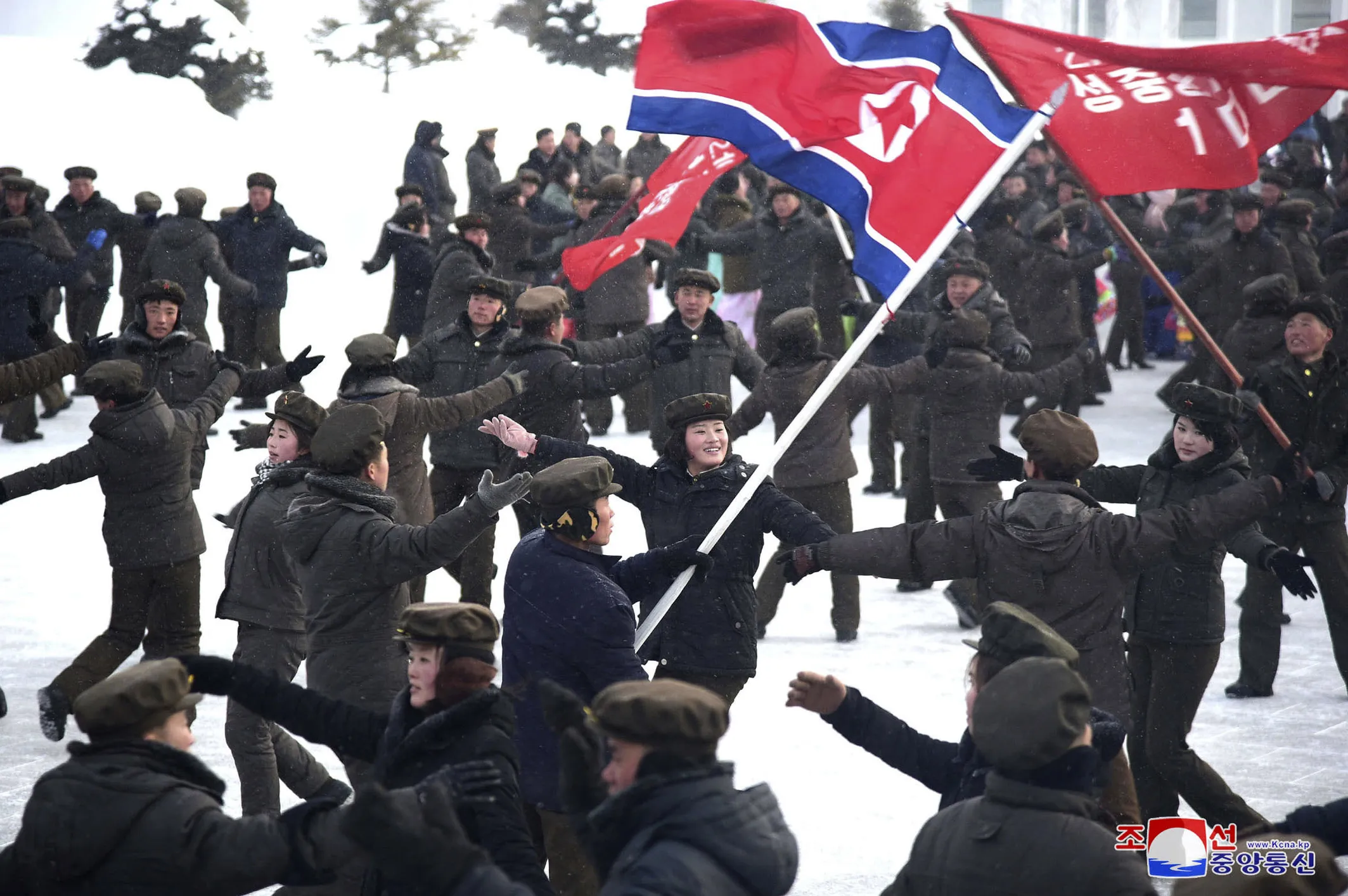 In this Monday, Dec. 2, 2019, photo provided Tuesday, December 3, 2019, by the North Korean government, people dance to celebrate the completion of Samjiyon city. On Monday, North Korean leader Kim Jong Un visited Samjiyon county at the foot of Mount Paektu to attend a ceremony marking the completion of work that has transformed the town to “an epitome of modern civilization”, KCNA said. It said the town has a museum on the Kim family, a ski slope, cultural centers, a school, a hospital and factories. Independent journalists were not given access to cover the event depicted in this image distributed by the North Korean government. The content of this image is as provided and cannot be independently verified. Korean language watermark on image as provided by source reads: “KCNA” which is the abbreviation for Korean Central News Agency. (Photo by Korean Central News Agency/Korea News Service via AP Photo)