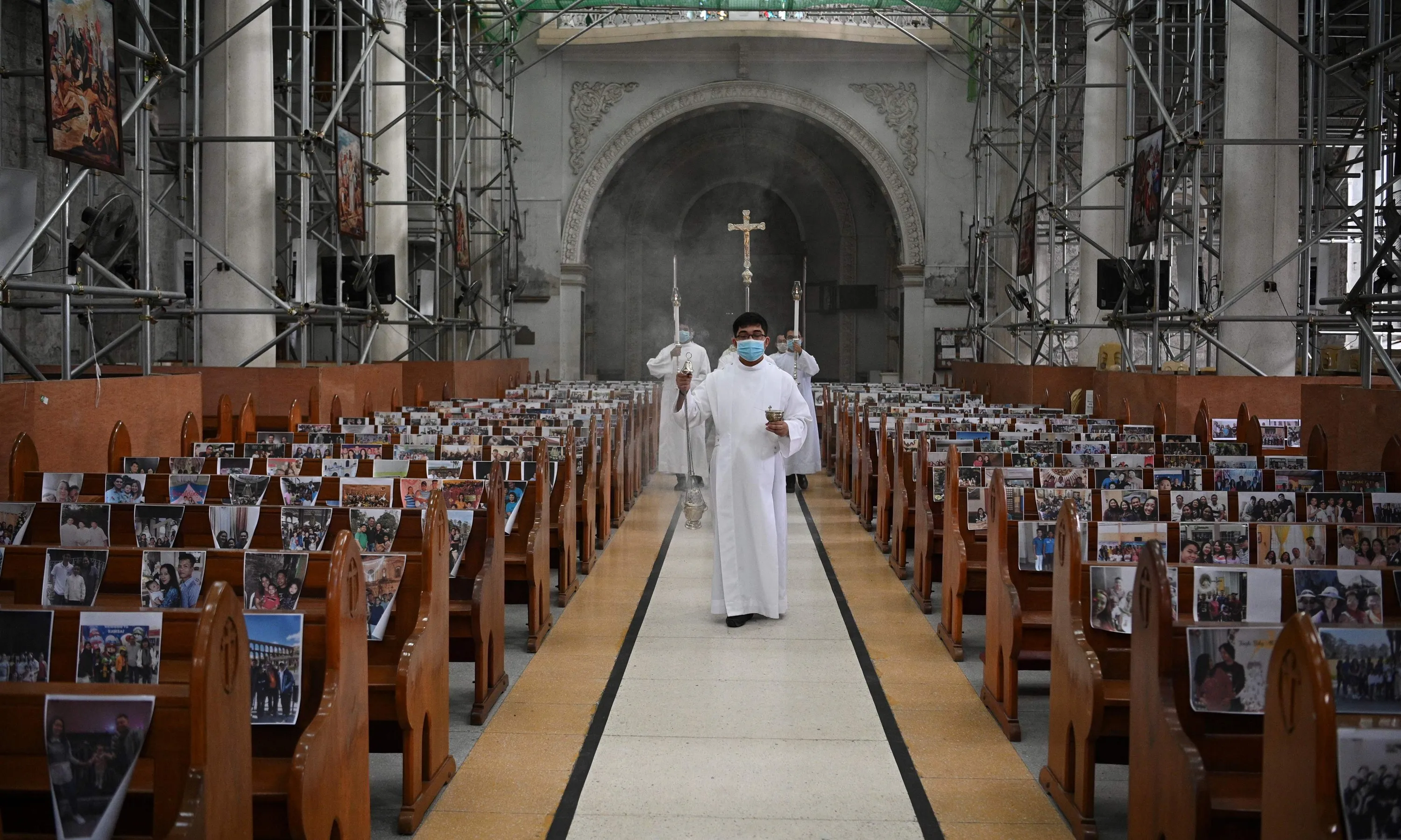 Catholic church altar boys walk down the aisle through the empty Holy Rosary parish church with photos of parishioners taped on church pews, as part of social distancing measures amidst the COVID-19 pandemic, at the start of a procession for Easter Sunday mass in Angeles City, Pampanga province on April 12, 2020. (Photo by Ted Aljibe/AFP Photo)