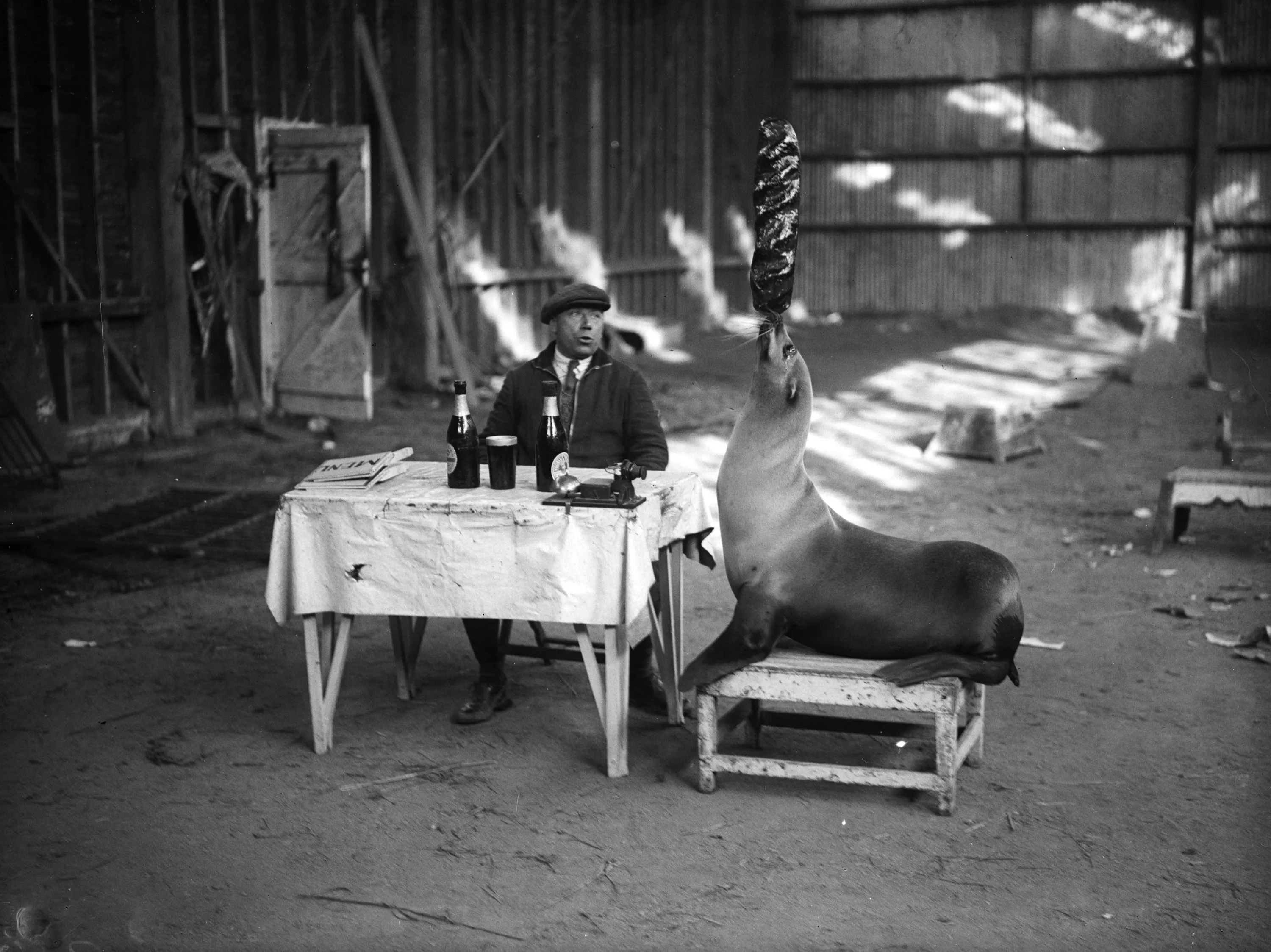 A performing seal practises one of its feats for the “crazy restaurant” routine at the Sangers Circus Revue in Reading. The animal sits at table next to its co-performer and juggles with the food and utensils. 24th March 1932.