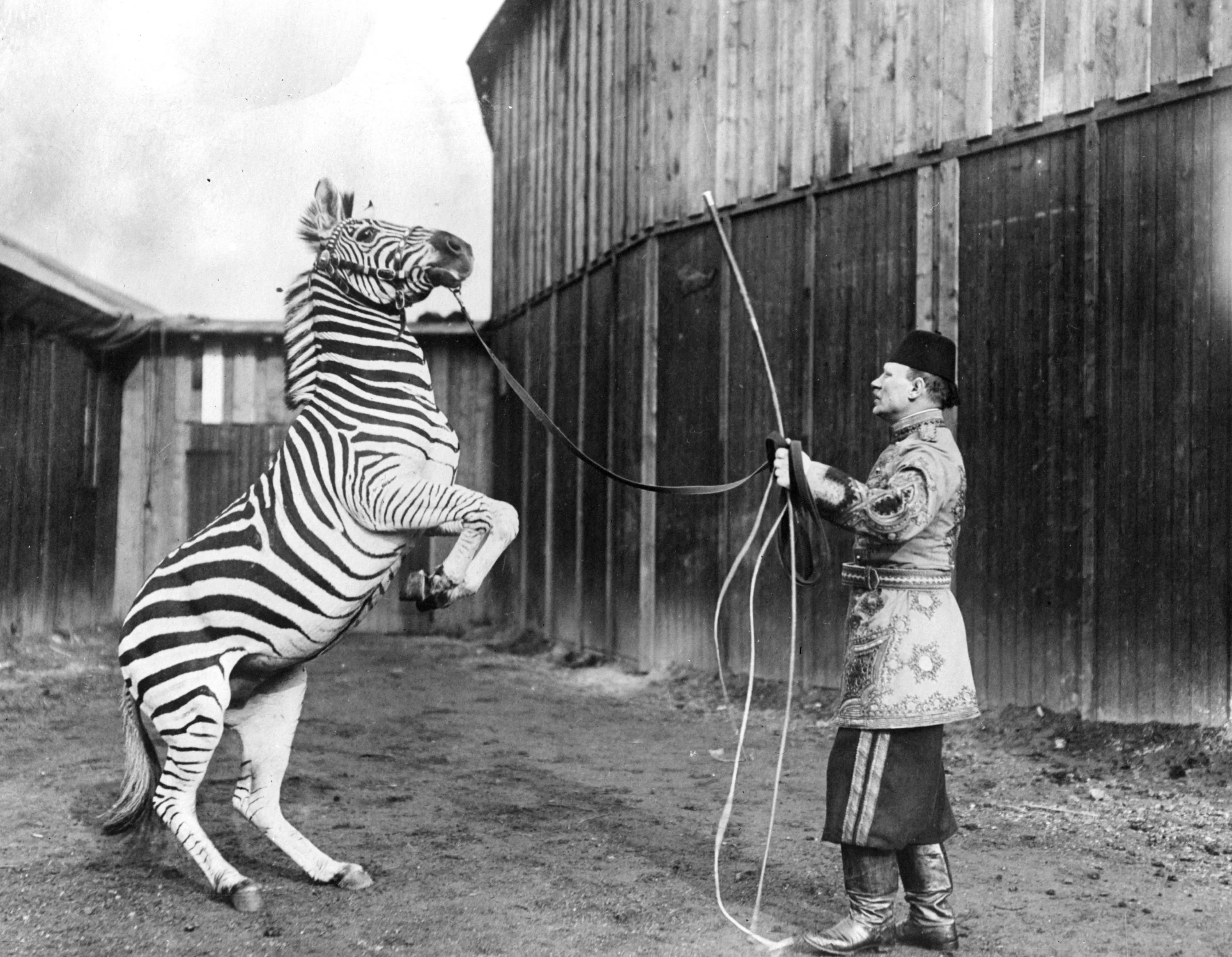 A circus performer trains a zebra to stand on its hind legs, circa 1920.