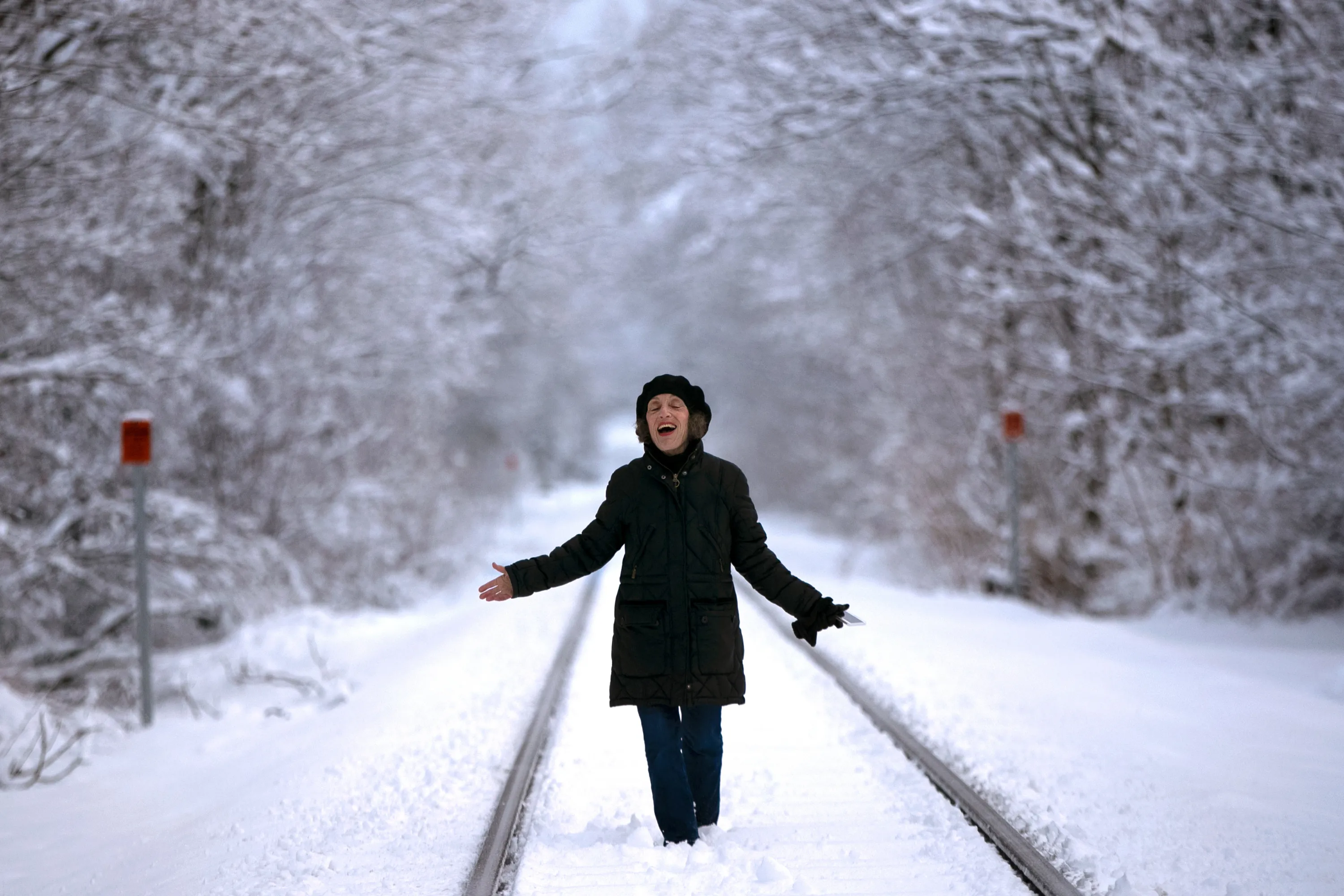 Ellen Werner enjoys the snow-covered landscape following an early spring snowstorm that dumped several inches of heavy, wet snow, Tuesday, March 24, 2020, in Freeport, Maine. Werner, of New York City, is self-quarantining at a condo in Freeport to be near her children. She is not sick but wanted to be out of New York. (Photo by Robert F. Bukaty/AP Photo)