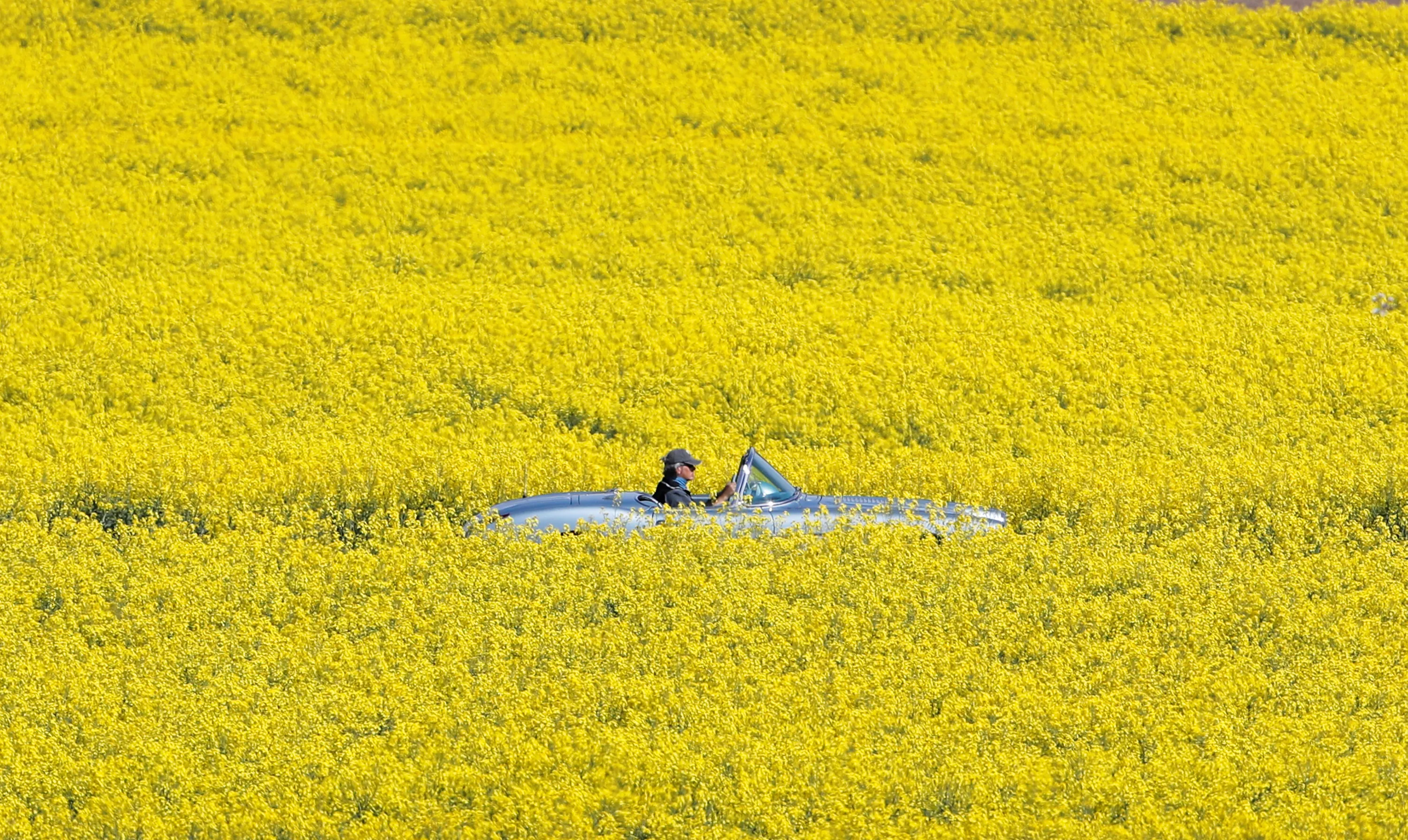 A man drives a convertible car, amid an outbreak of the coronavirus disease (COVID-19), during sunny spring weather on a road between two rape fields near Schinznach-Dorf, Switzerland on April 16, 2020. (Photo by Arnd Wiegmann/Reuters)