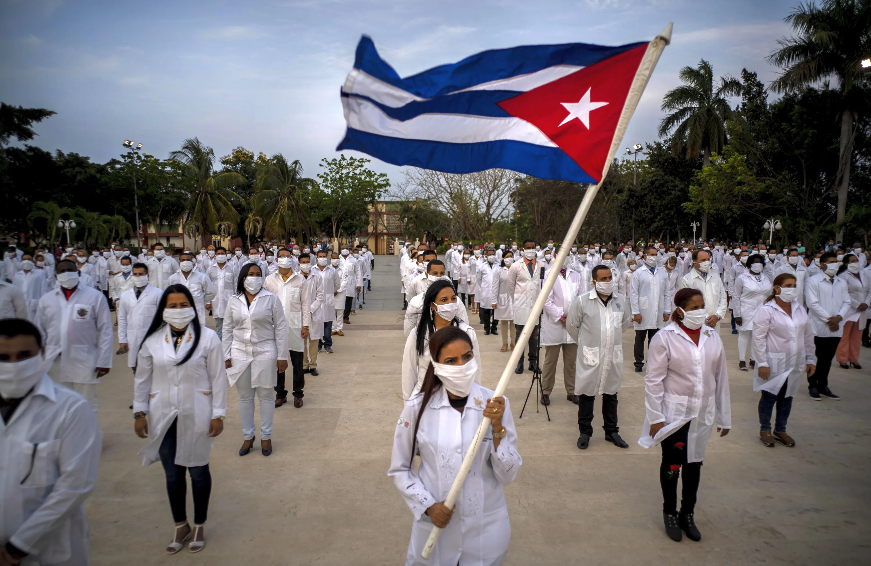 A brigade of health professionals, who volunteered to travel to South Africa to assist local authorities with an upsurge of coronavirus cases, attend the farewell ceremony in Havana, Cuba, Saturday, April 25, 2020. (Photo by Ramon Espinosa/AP Photo)