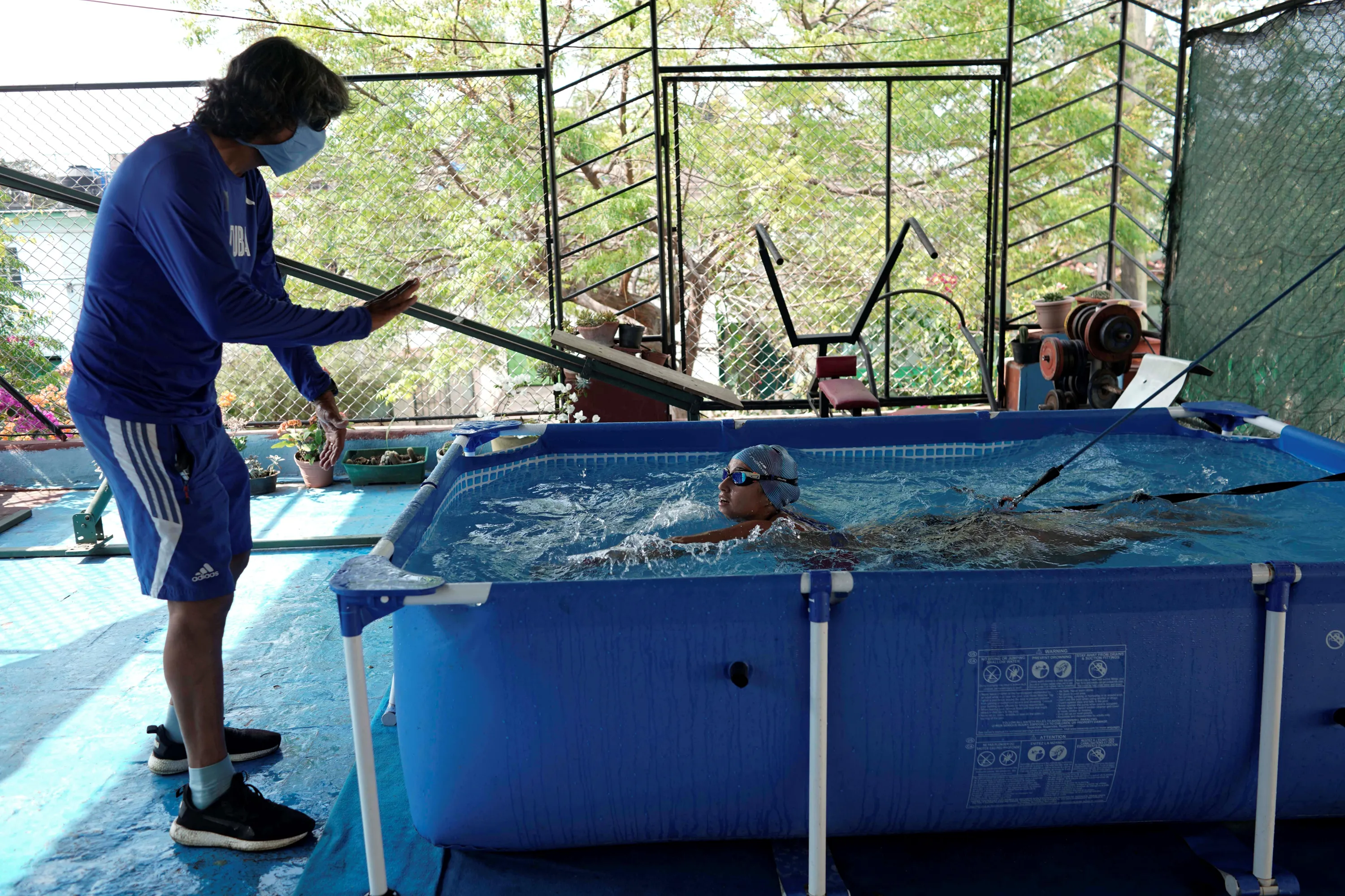 Elite Cuban triathlete Leslie Amat receives instructions from her coach during a training session on the roof of her home in Havana, Cuba, April 17, 2020. (Photo by Alexandre Meneghini/Reuters)