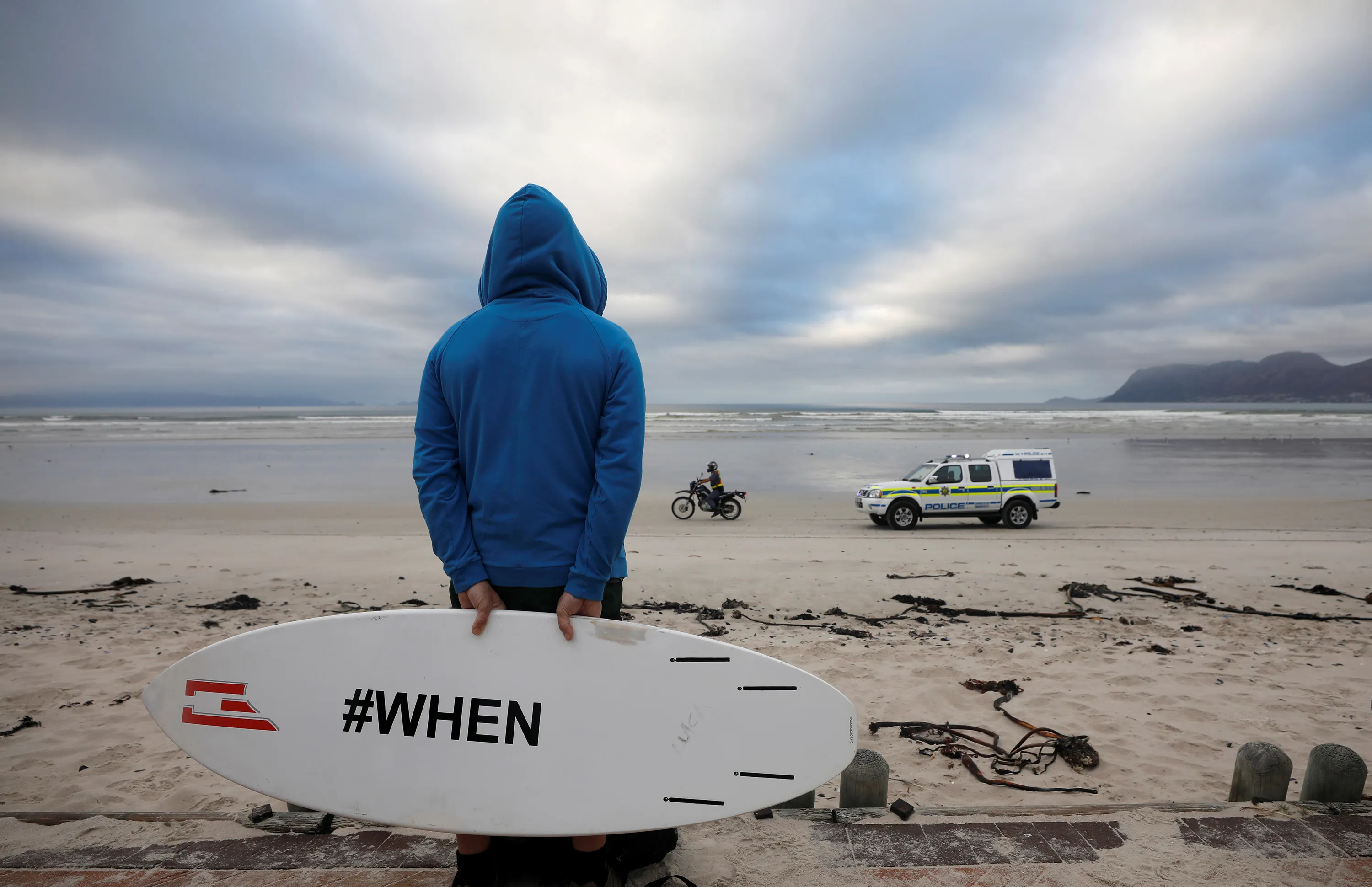 Police patrols as surfers and other ocean users protest against the nationwide lockdown regulations that allow exercise but not water activities, amid the coronavirus disease (COVID-19) outbreak, at Muizenberg beach in Cape Town, South Africa on May 5, 2020. (Photo by Mike Hutchings/Reuters)