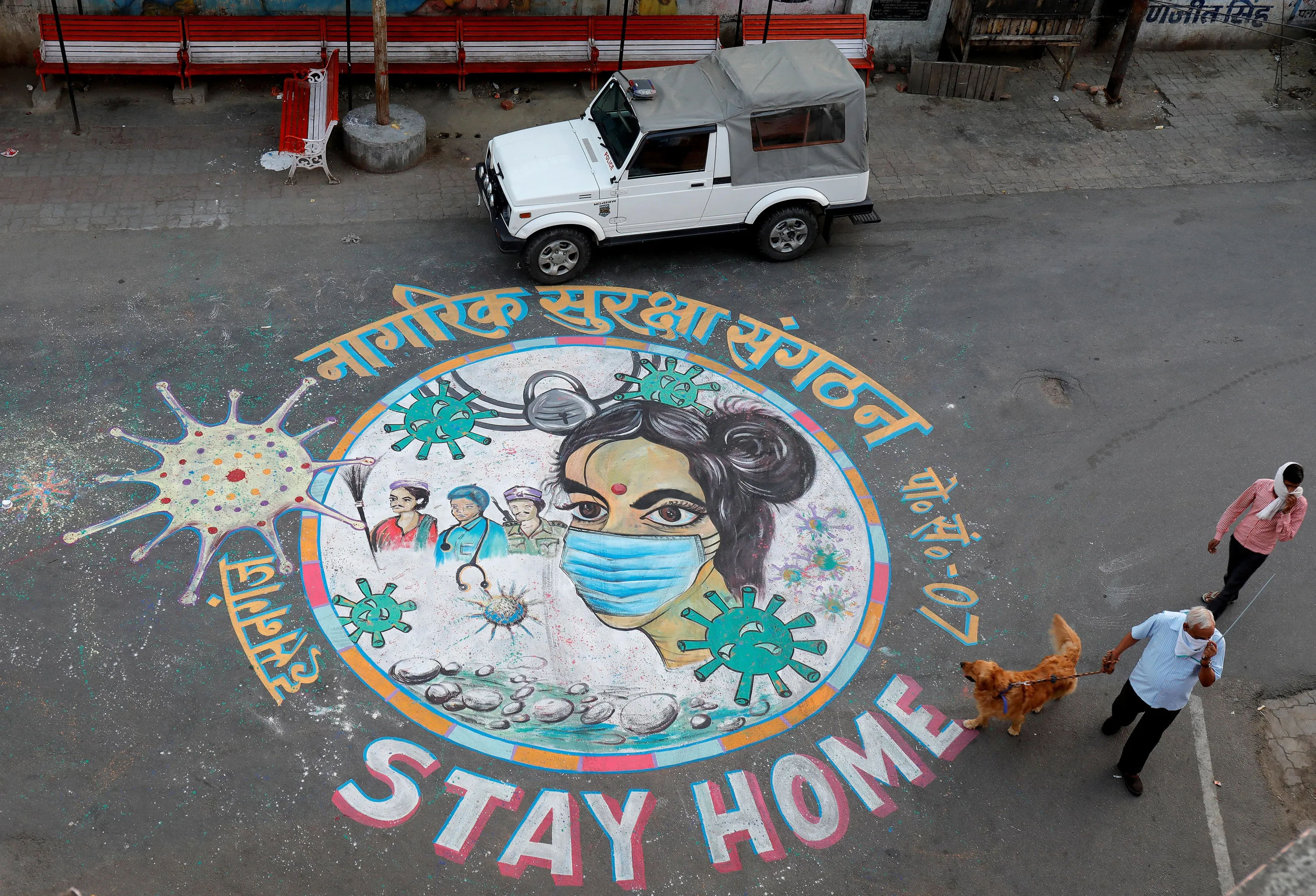 A man walks his dog past a graffiti on a road to create awareness about staying at home during an extended nationwide lockdown to slow the spreading of coronavirus disease (COVID-19) in Lucknow, April 22, 2020. (Photo by Pawan Kumar/Reuters)