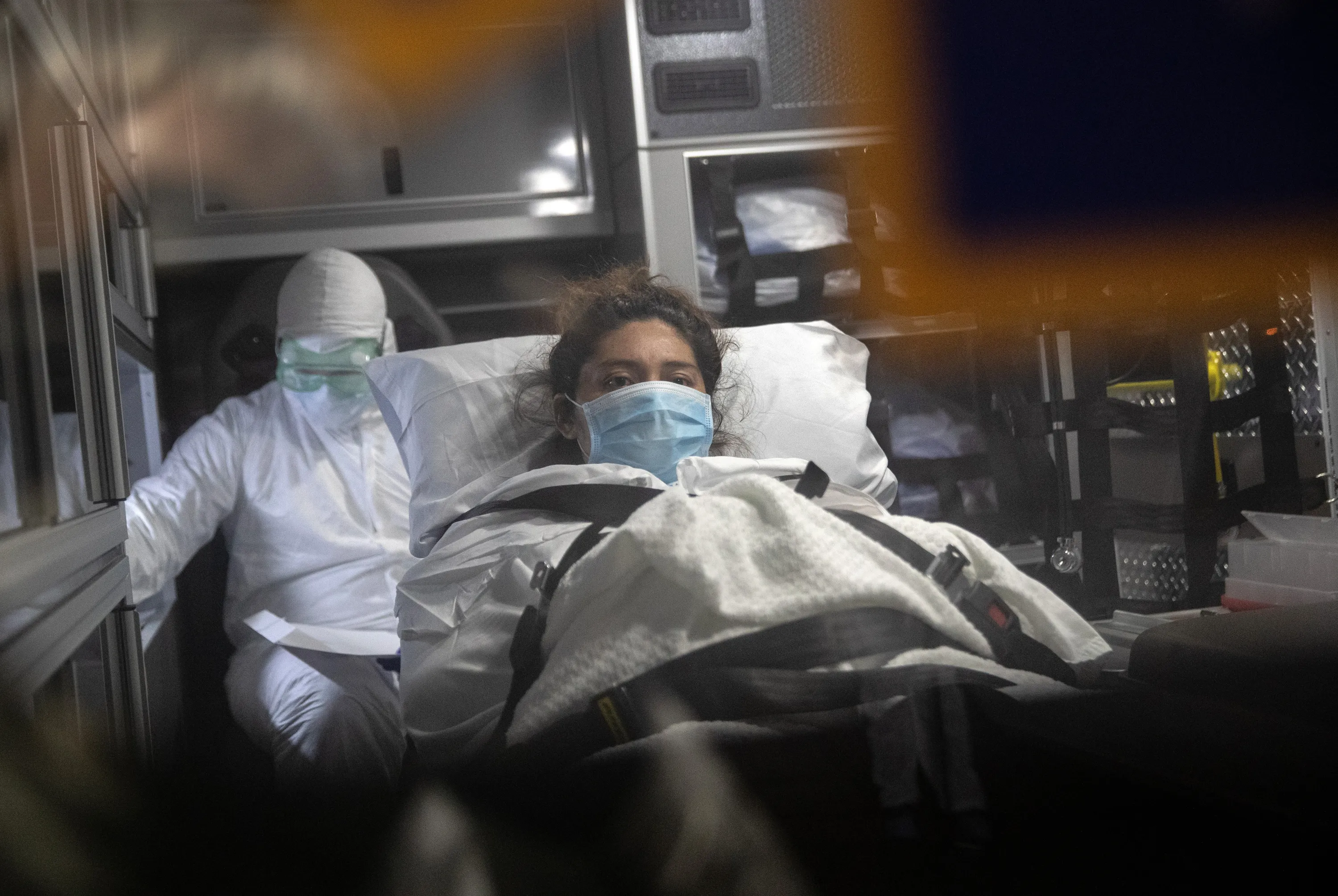 EMS paramedics in PPE bring Zully, a COVID-19 patient, new mother and Guatemalan asylum seeker home by ambulance from Stamford Hospital on April 25, 2020 in Stamford, Connecticut. Weeks before she had gone to the hospital, eight months pregnant and gravely ill with coronavirus. Doctors performed an emergency C-section to deliver her baby boy Neysel. Zully was put on a ventilator and remained in critical condition until a plasma antibody trial appeared to greatly improve her condition. A few days after medical staff took her off the ventilator, she was released from the hospital, although still positive for coronavirus and to quarantine at home. She has yet to hold her baby, who is healthy and temporarily staying with her older son's teacher Luciana Lira. The K-5 Bilingual /ESL instructor at Hart Magnet Elementary School continues remote teaching her elementary school students, while also caring for the Zully's infant at home. She plans to continue as the baby's temporary custodian until the entire Guatemalan family, including Zully, the child's father Marvin and their son Junior, 7, also recover and test negative for the virus. The ambulance was paid for by the immigrant advocacy organization Building One Community, (B1C) which is also assisting the family with food and supplies during their quarantine. (Photo by John Moore/Getty Images)